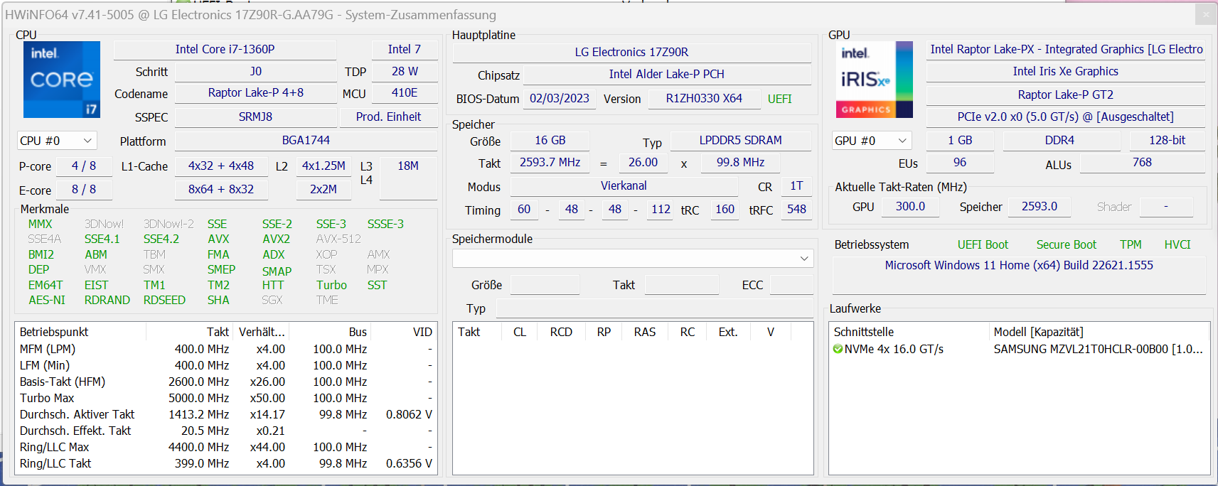 En låg vikt på cirka 1,35 kg och en realistisk batteritid på cirka 11-14 timmar gör Gram till en mobil bärbar dator. Två USB-C-portar (Thunderbolt 4/USB 4) förser den bärbara datorn med ström, vilket också gör att den bärbara datorn enkelt kan integreras i en befintlig arbetsplatsinstallation. Den matta 17-tums IPS-displayen (2 560 x 1 600 pixlar) i det arbetsvänliga 16:10-formatet är också imponerande. Till exempel täcks DCI-P3-färgrymden nästan helt och hållet. Hela paketet avrundas av ett skarpt tangentbord.