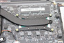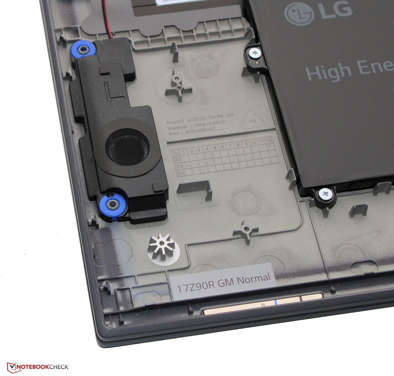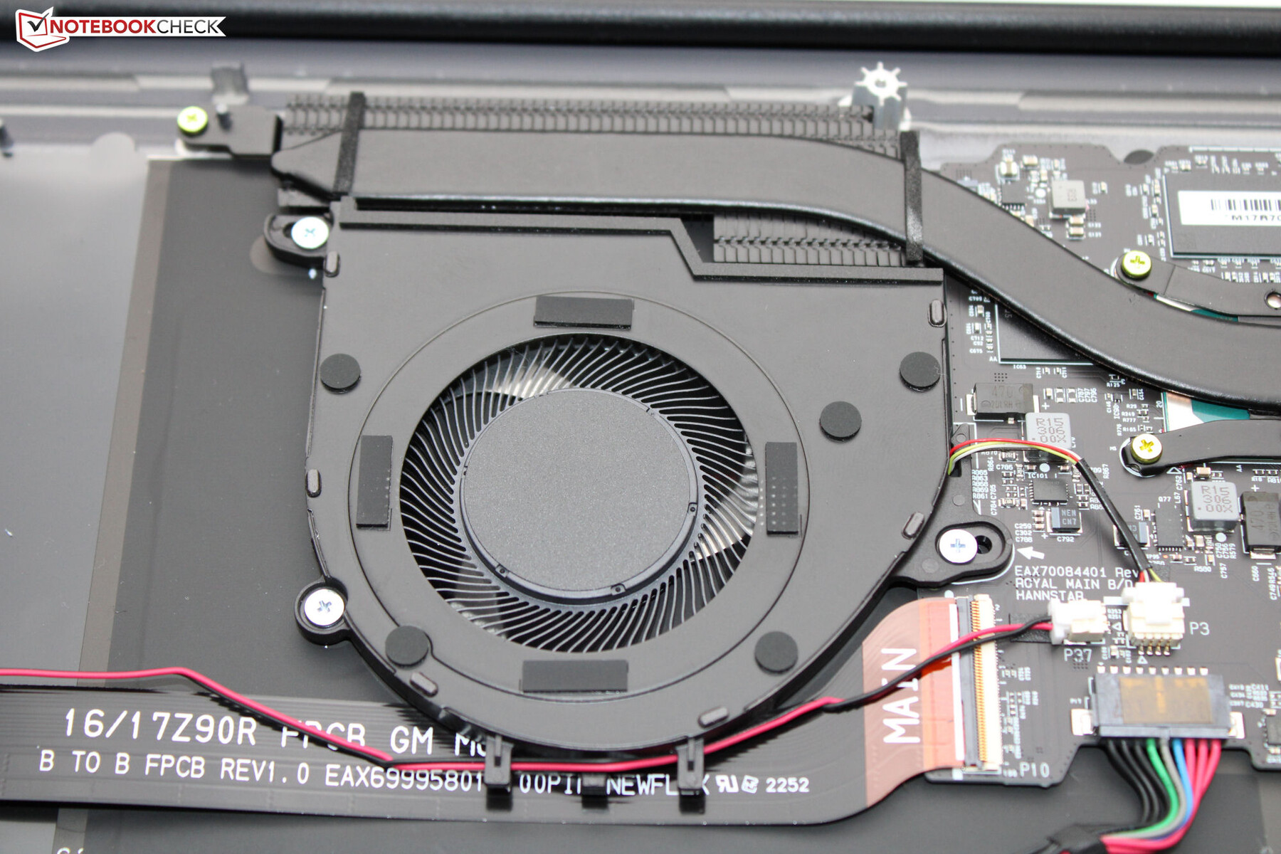 Du kommer åt insidan genom att ta bort botten av fodralet. Några av de skruvar du måste ta bort är dolda under några små påklistrade plattor (se bilder), och det finns ytterligare skruvar under två påklistrade gummifötter. De små plättarna kan avlägsnas med en liten platt skruvmejsel. När du har tagit bort skruvarna måste du försiktigt (!) lossa på botten av fodralet, som annars lätt kan böjas. Ett platt brytverktyg som till exempel en spatel visade sig vara till stor hjälp vid denna uppgift. Efter att ha tagit bort botten får du tillgång till SSD:n (PCIe 4, M.2-2280), facket för en andra SSD (PCIe 4, M.2-2280), fläkten, högtalarna och batteriet.