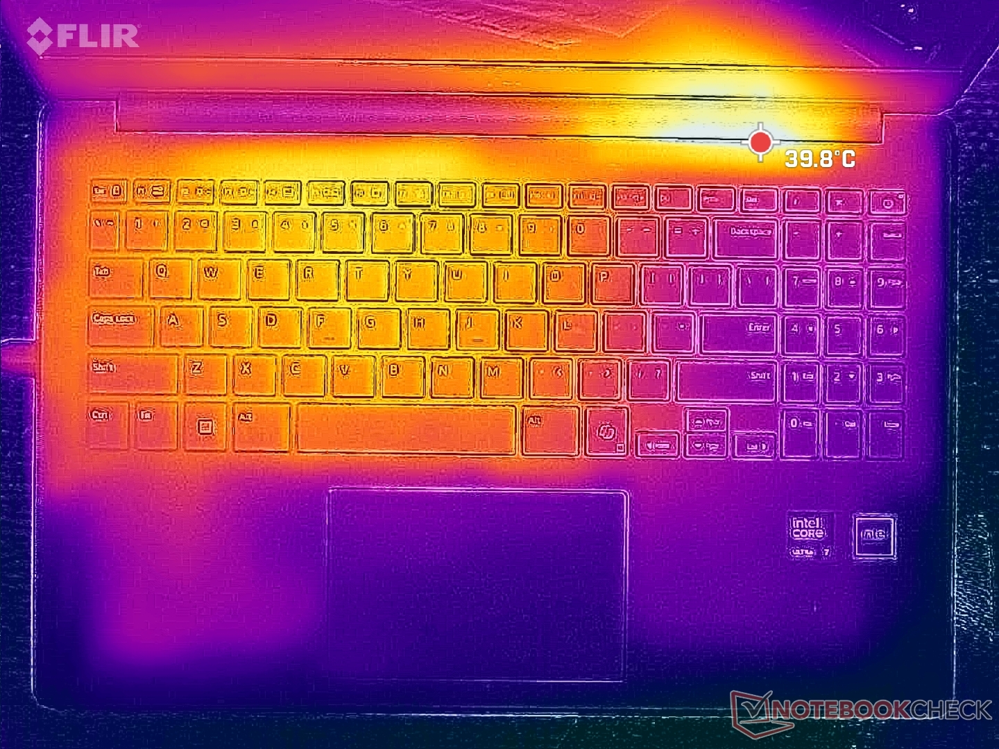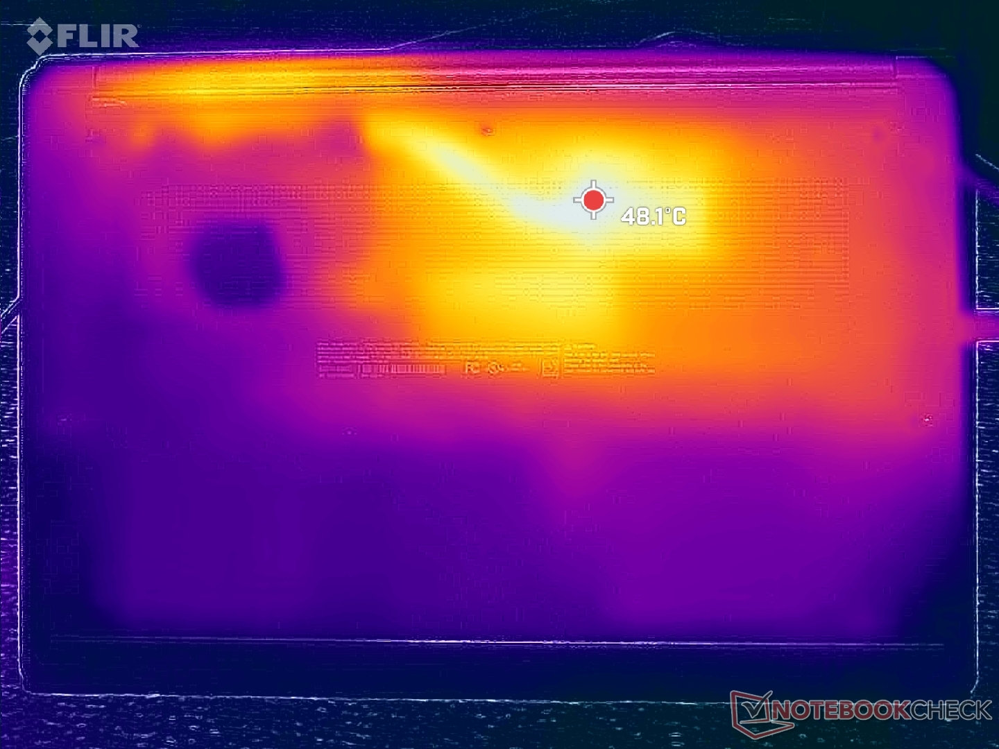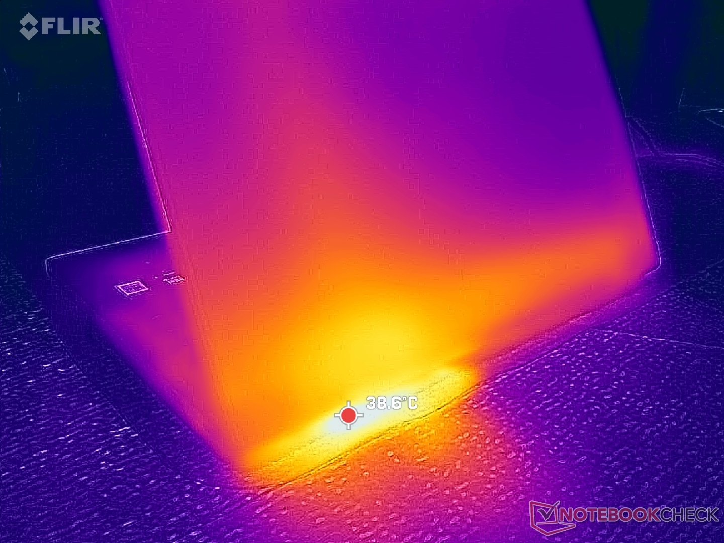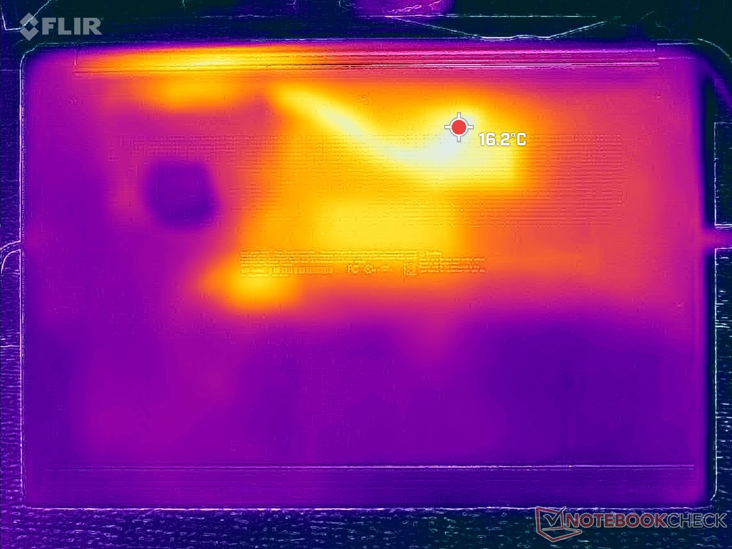 Hot spots för yttemperatur kan bli mycket varmare på bottenlocket än på tangentbordsdäcket med så mycket som 9 C, vilket framgår av temperaturkartorna nedan. Medeltemperaturen är ändå märkbart svalare än vad vi registrerade på 2023 LG Gram SuperSlim.