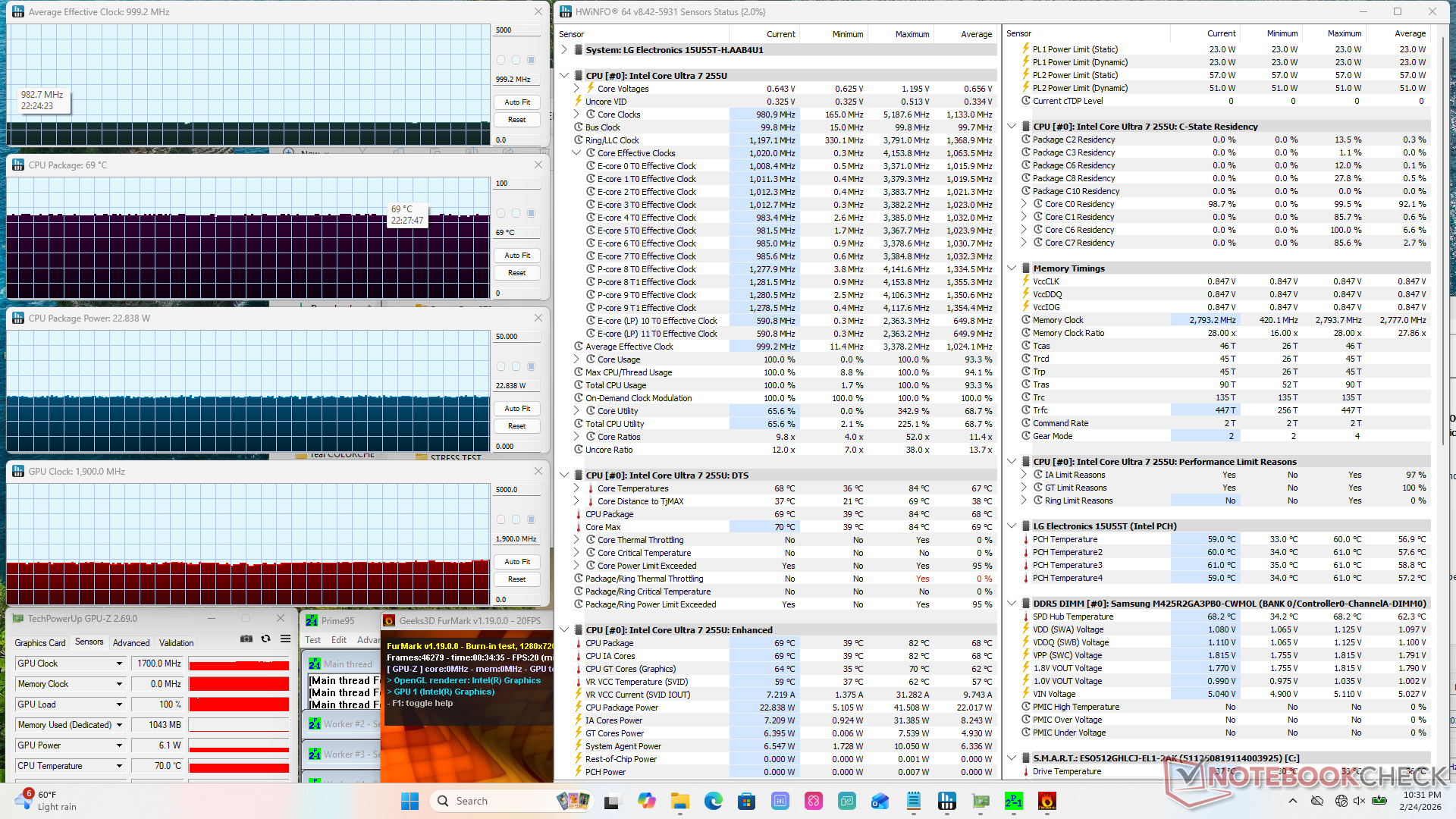 | Prime95 + FurMark Stress | 1.0 | 1900 | 69 |