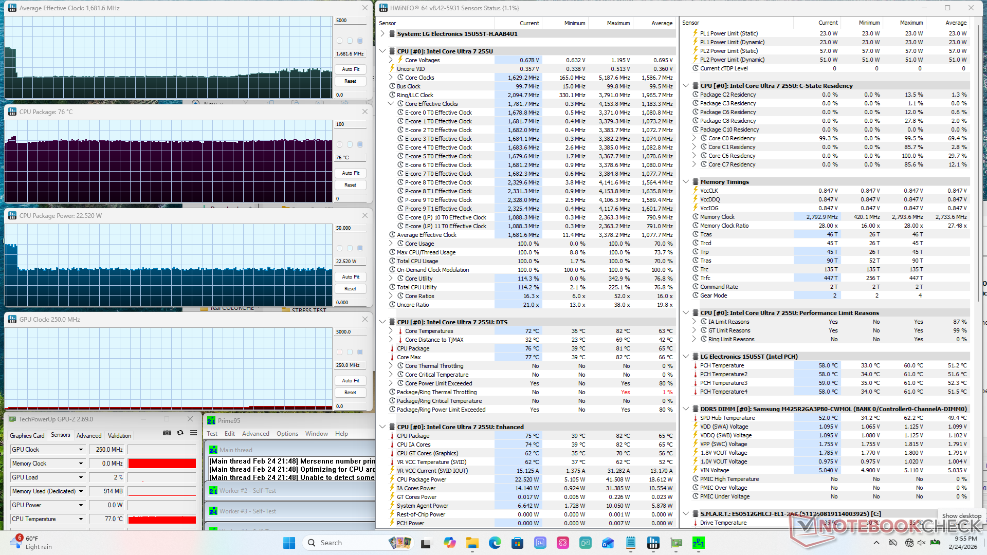 Processorn ökade till 3,4 GHz och 42 W när Prime95-stress initierades innan den nådde 82 C bara några ögonblick senare. Den stabiliserades sedan på 1,6 GHz, 76 C och 23 W därefter, vilket visas av skärmdumparna nedan för att beteckna dålig Turbo Boost-hållbarhet.