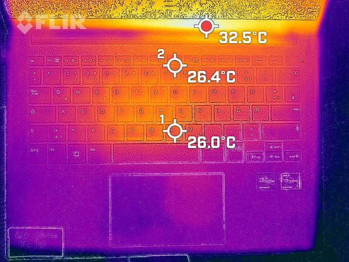Den bärbara datorn producerar knappt någon värme vid tomgång. Dess yta låg endast 2-3 °C över rumstemperaturen när vi mätte den. Under stresstestet steg temperaturen på chassit till 44-45 °C (111-113 °F) på vissa ställen. Detta är ganska tolerabelt i knät eftersom de varmare områdena ligger på baksidan av enheten.