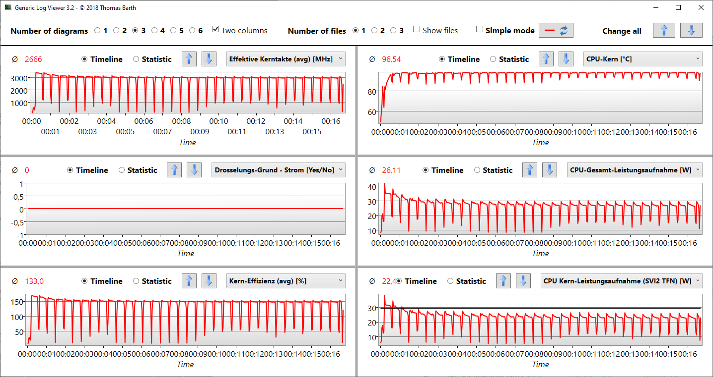 Det skedde en betydande minskning av CPU- och GPU-frekvenserna under stresstestet. I det här scenariot slet båda sektionerna av SoC:n samtidigt samtidigt som de var tvungna att dela på den blygsamma TDP:n. CPU:n och iGPU:n startade på 30 watt respektive 25 watt och sjönk sedan ner till 20 respektive 18 watt när testet pågick. Kärnans temperatur låg kvar på ungefär 90 °C (194 °F) under denna tid.