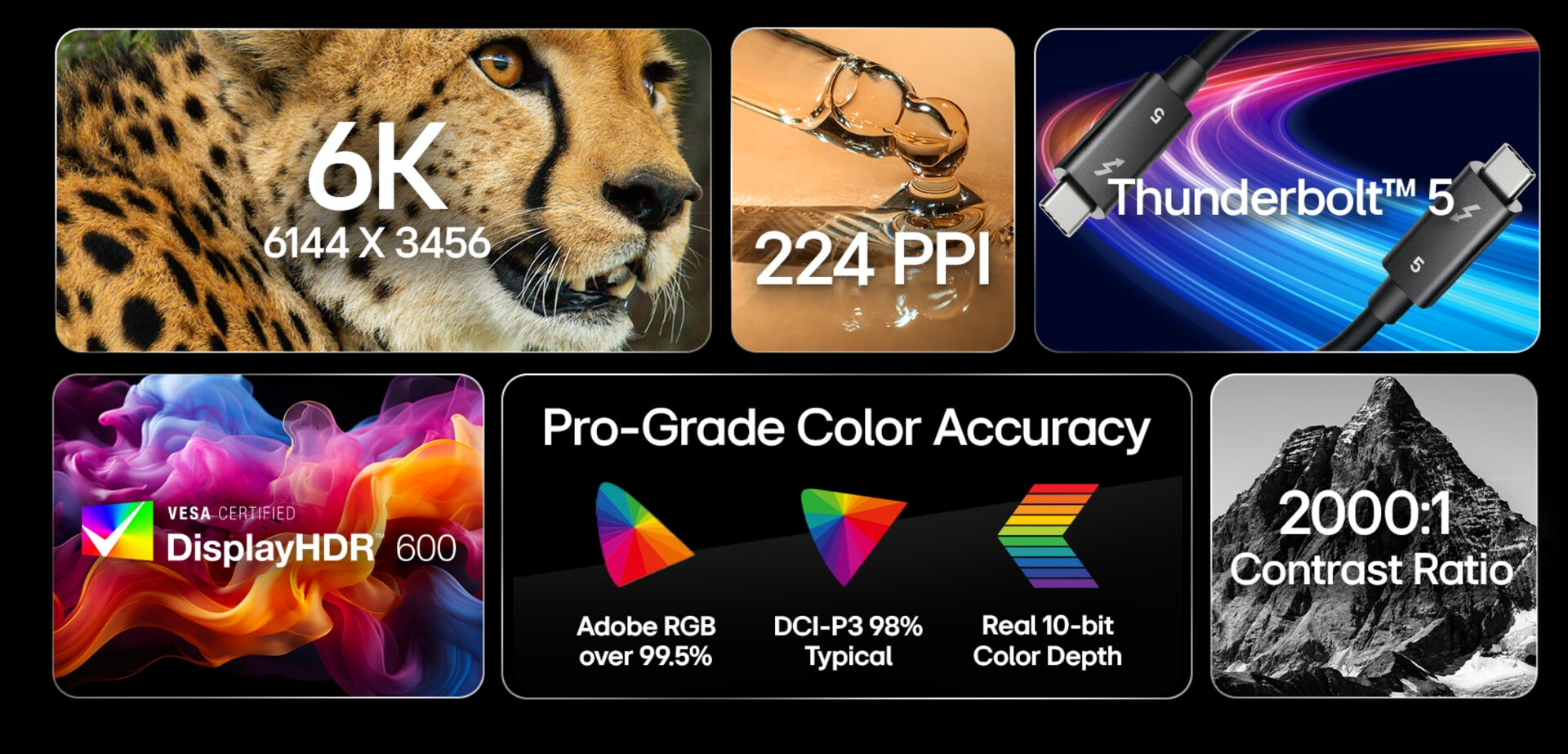 UltraFine 32U990A liknar en Apple Studio Display ( för närvarande 1 699 USD på Amazon) och har 6 144 x 3 456 pixlar över sin 31,5-tums IPS-panel för att leverera en pixeldensitet på 224 PPI. Dessutom levererar bildskärmen 98% DCI-P3 och 99,5% AdobeRGB färgrymdstäckning med 450 nits topp SDR och 600 nits HDR ljusstyrka. Tyvärr begränsar LG bildskärmens uppdateringsfrekvens till 60 Hz, vilket ofta är fallet för professionella bildskärmar där visuell trohet värderas högre än bildhastighet.