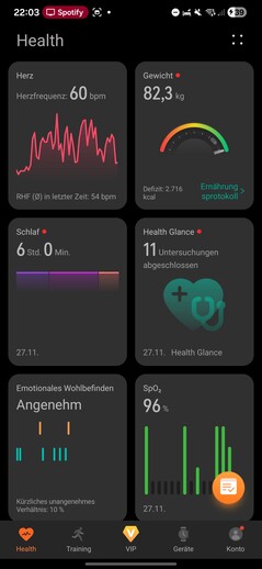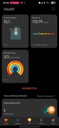 Health-appen är indelad i fem sektioner: Hälsa, Träning, VIP, Enheter och Konto. Fliken Hälsa fungerar som en instrumentpanel för alla registrerade biometriska data, som visas som anpassningsbara brickor.