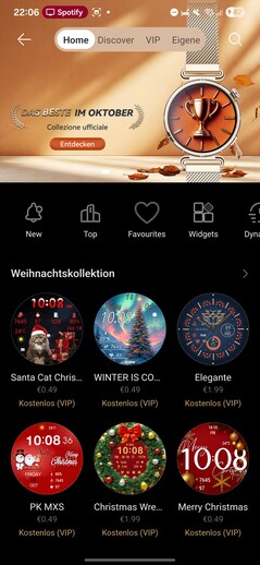 Avslutade träningspass visas under Träning. VIP låser upp åtkomst till den betalda Plus-nivån. Fliken Devices innehåller inställningar, AppGallery, musikhantering och ett stort urval av urtavlor.