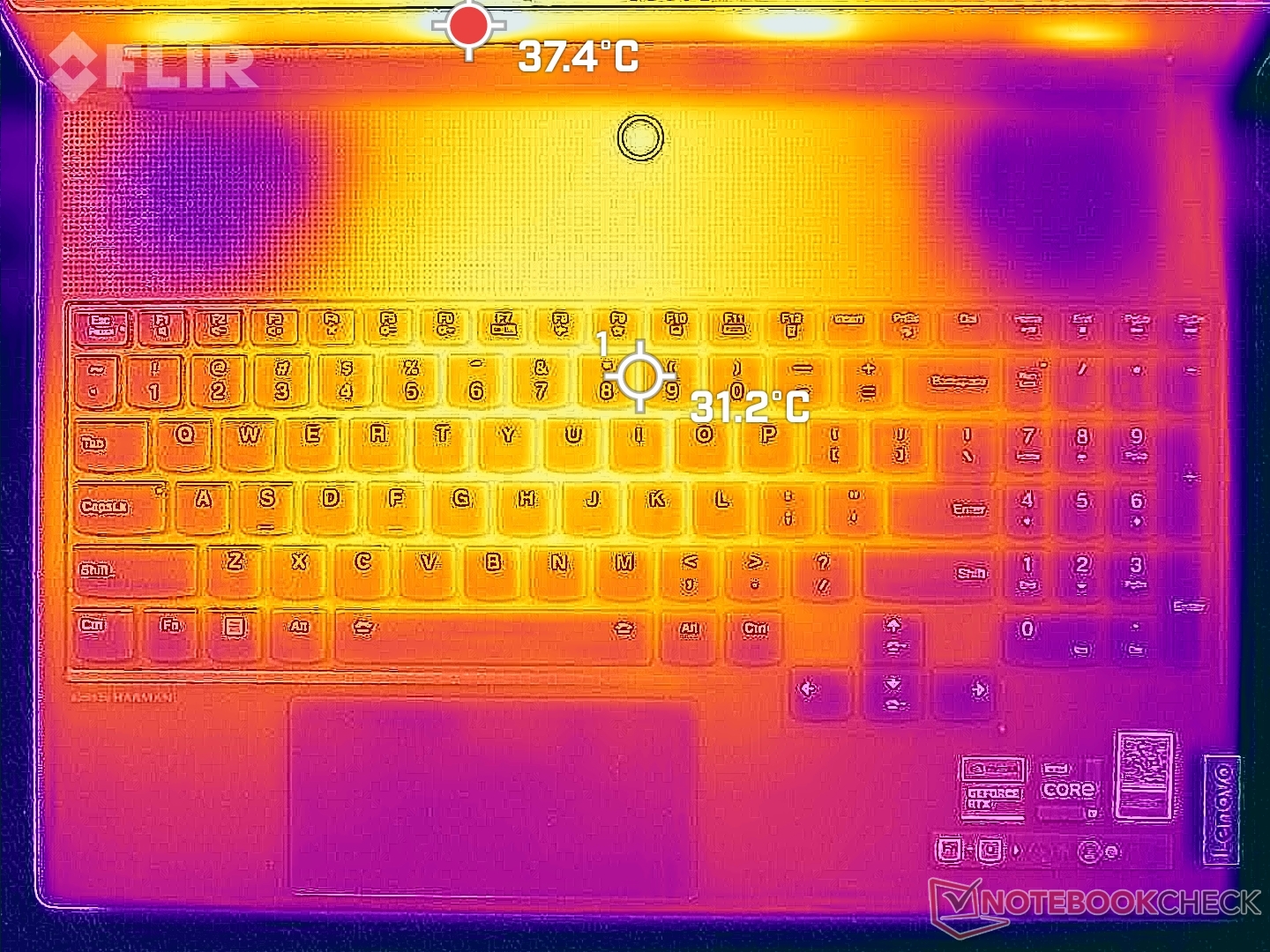 Yttemperaturerna är ganska varma trots den avancerade termiken. När du spelar kan WASD-tangenterna och tangentbordets mitt vara så varma som 42 C respektive 46 C, vilket är något varmare än vad vi observerade på Alienware x16 R1. Många andra bärbara speldatorer som Razer Blade 16 drar in frisk luft från WASD-tangenterna för att hålla den delen av tangentbordet svalt för bekvämare spel, men detta är inte fallet för vår Legion 9 16-design, vilket framgår av temperaturkartorna nedan.