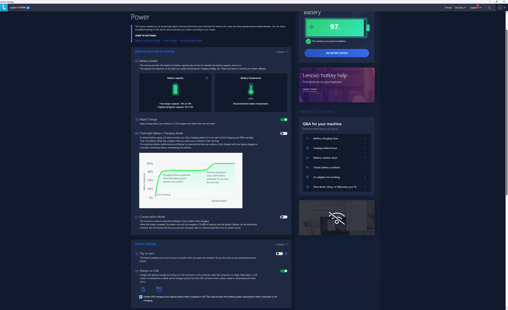 Laddningen är åtminstone mycket snabb, ungefär en timme när Lenovo Rapid Charge är aktiverat, jämfört med 90 minuter eller längre på de flesta andra bärbara speldatorer. USB-C-adaptrar från tredje part kan också ladda systemet, om än långsammare och med icke garanterad kompatibilitet.