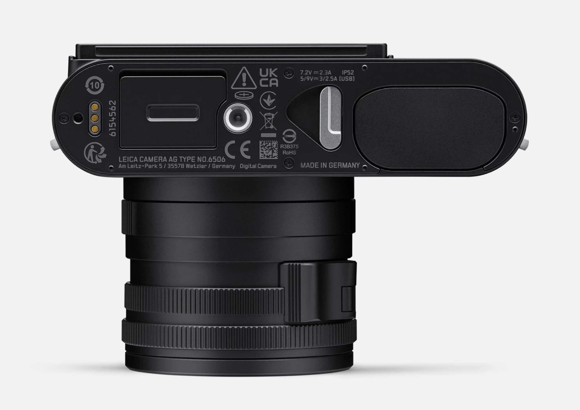 Designen på den här bilden har två fördelar jämfört med Leica M11. För det första kan skjutreglaget som frigör batteriet från kamerahuset manövreras lättare i sin nya position medan en snabbkopplingsplatta är fäst på kameran. För det andra har Leica lagt till tre metallkontakter för tillbehör. På Leica Q3 används dessa för ett handtag som gör att kameran kan laddas trådlöst på en Qi-laddningsplatta.