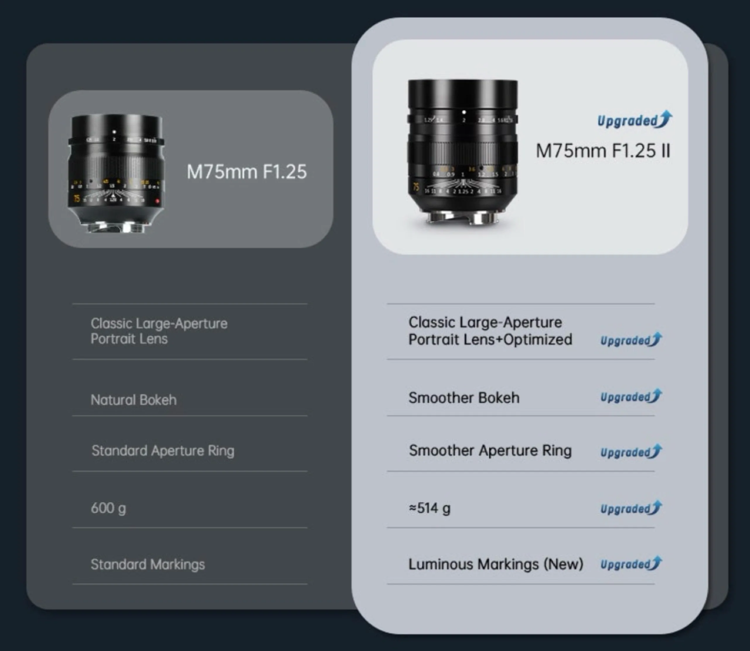 Vikten har minskat från 600 gram till 514 gram, bländarringen uppges fungera smidigare och enligt tillverkarens marknadsföring ser bokeh också bättre ut än på den tidigare modellen. Objektivet marknadsförs tydligt som ett mer prisvärt alternativ till Leica Noctilux-M 1,25/75 ASPH, som med sitt pris på 15 615 dollar inte bara är betydligt dyrare utan också dubbelt så tungt. De som väljer 7Artisans-objektivet får nöja sig med en jämförelsevis lägre bildkvalitet