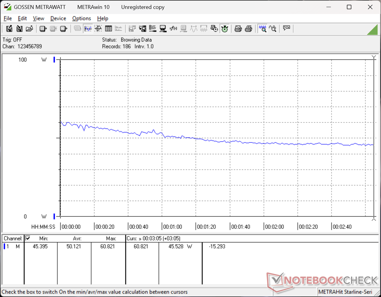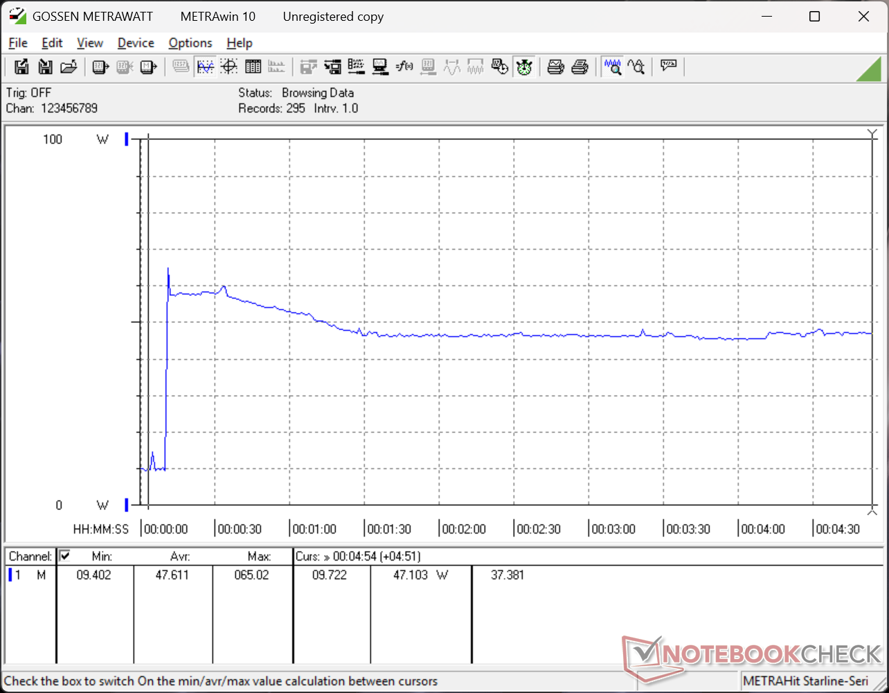 Systemet kan dra hela 65 W från den lilla (9 x 4,6 x 2,7 cm) USB-C AC-adaptern när processorn är fullt belastad, men det är bara tillfälligt, vilket framgår av grafen nedan.