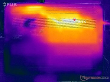 Yttemperaturerna är varmare på den bärbara datorns vänstra sida än på den högra på grund av kylsystemets placering på insidan. Varma punkter på tangentbordet och botten kan nå upp till 30 C respektive 40 C, jämfört med 36 C respektive 49 C på Asus Chromebook Flip CX5. Vi tycker inte att Lenovo är obehaglig för huden trots temperaturskillnaderna mellan sidorna.