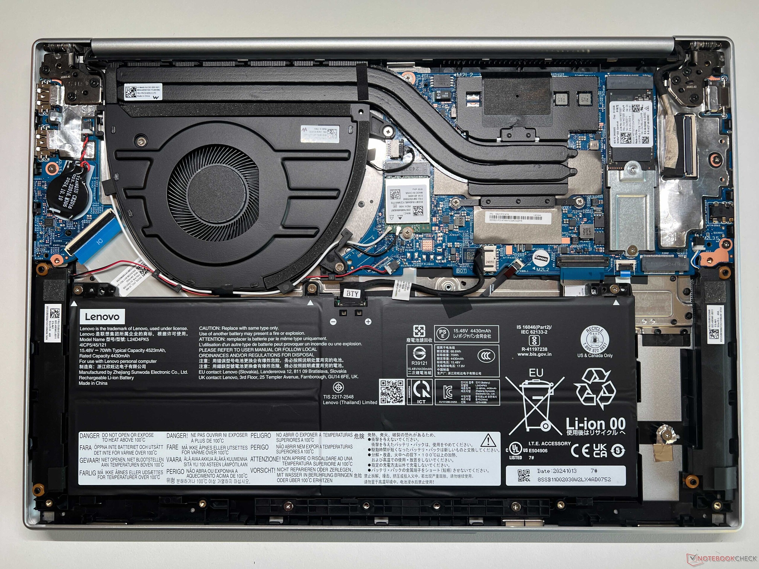 Med en vikt på drygt 1,5 kg och en tjocklek på 15,6 mm är IdeaPad lätt att transportera. Bottenlocket kan enkelt tas bort och det finns två platser för M.2 2280 SSD-enheter bredvid WLAN-modulen, så att du enkelt kan uppgradera lagringskapaciteten. RAM-minnet (LPDDR5x-6400) är fastlödd och kan inte utökas.