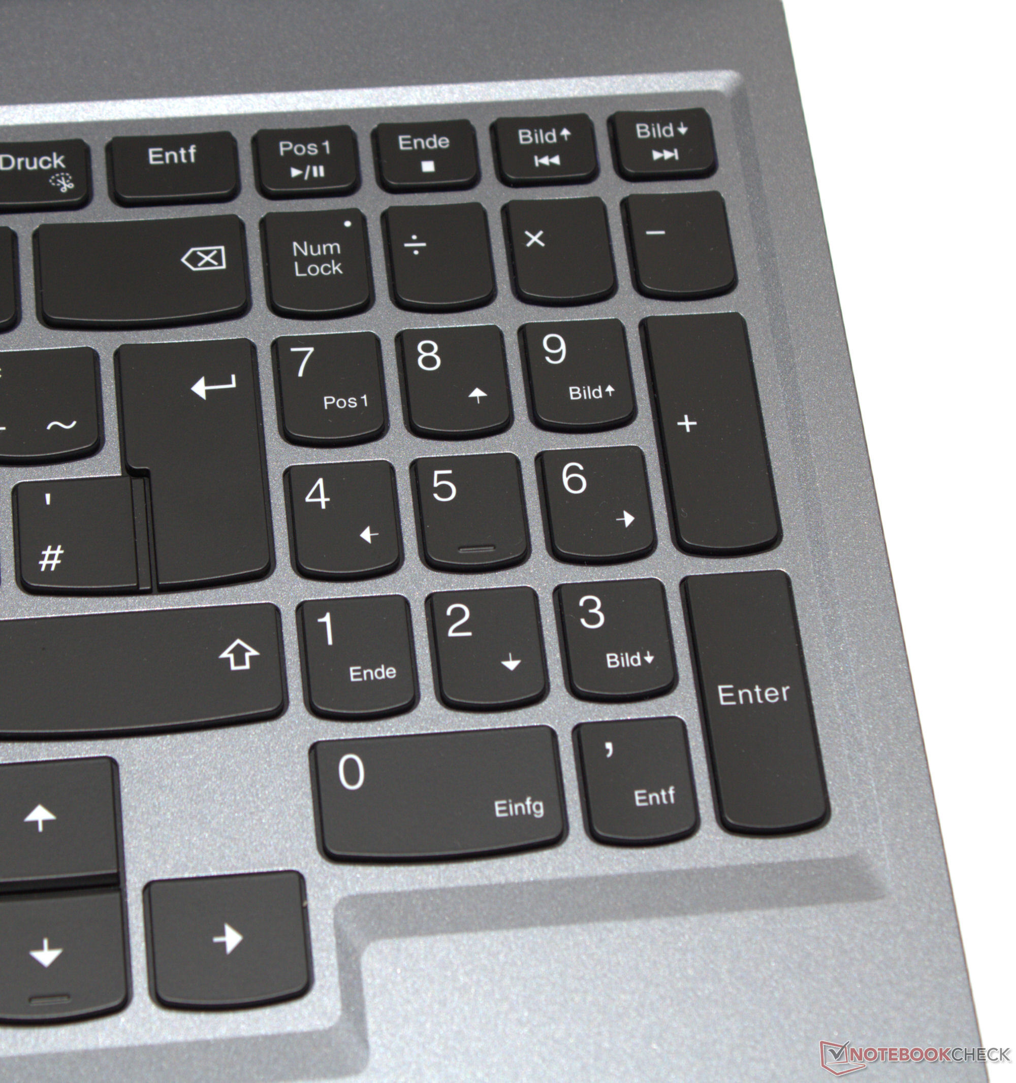 Chiclet-tangentbordet med vit bakgrundsbelysning sträcker sig över hela den bärbara datorns bredd och har dessutom en numerisk knappsats. Tangenternas form och placering motsvarar den välkända Lenovo-layouten. De konkava tangenterna ger ett bra motstånd och en tydlig tryckpunkt. Tangentbordet ger sig något när du skriver, men det är inte ett problem. En positiv sak: De förskjutna piltangenterna i full storlek är bekväma att använda. En multi-touch clickpad (ca 12 x 7,5 cm) med kort lyft och tydlig tryckpunkt fungerar som musersättning.