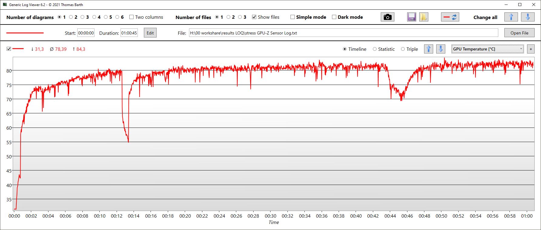 Å andra sidan ligger GPU-klockhastigheten kvar på relativt konstanta 2 200 MHz under hela testperioden, och lagringshastigheten är 2 GHz. Under denna tid värms GPU:n upp till maximalt 84 ºC (183 ºF). Strömförbrukningen är i genomsnitt 87 W.