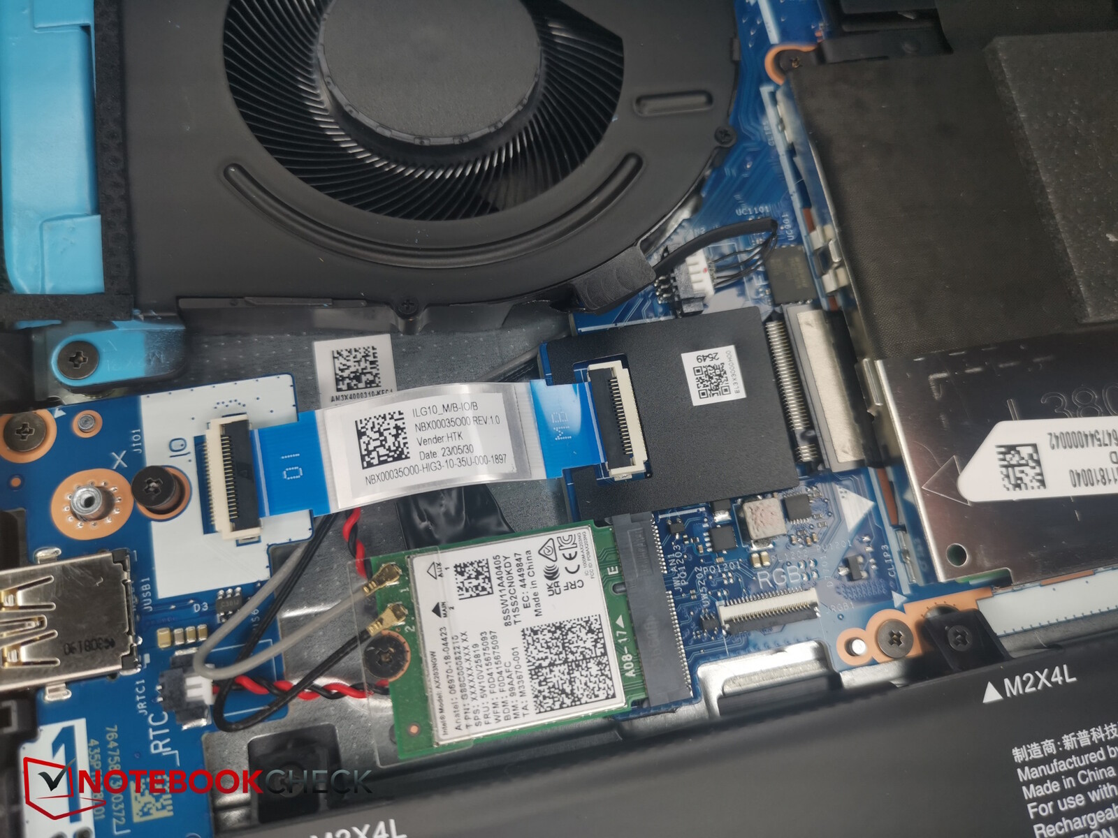 Inuti får du tillgång till fläktarna, batteriet, Wi-Fi-modulen, de två RAM-kortplatserna som är täckta av lite folie, SSD och den andra SSD-kortplatsen. Intressant nog använder Lenovo en kort SSD i M.2 2230-formfaktorn, även om det skulle finnas tillräckligt med utrymme för en vanlig M.2 2280 SSD och skruvramen för den finns också redan där.