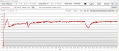 CPU-kärnorna inleder det timslånga stresstestet med Prime95 och Furmark körda samtidigt under en kort stund med en klockfrekvens över 4 GHz. Efter ca 30 sekunder sjunker klockhastigheten för att sedan plana ut på 2 300 MHz efter ca 3 minuter. Samtidigt sjunker TDP från 135 till slutligen konstanta 45 W. CPU:n värms upp till ca 80 ºC (176 ºF).