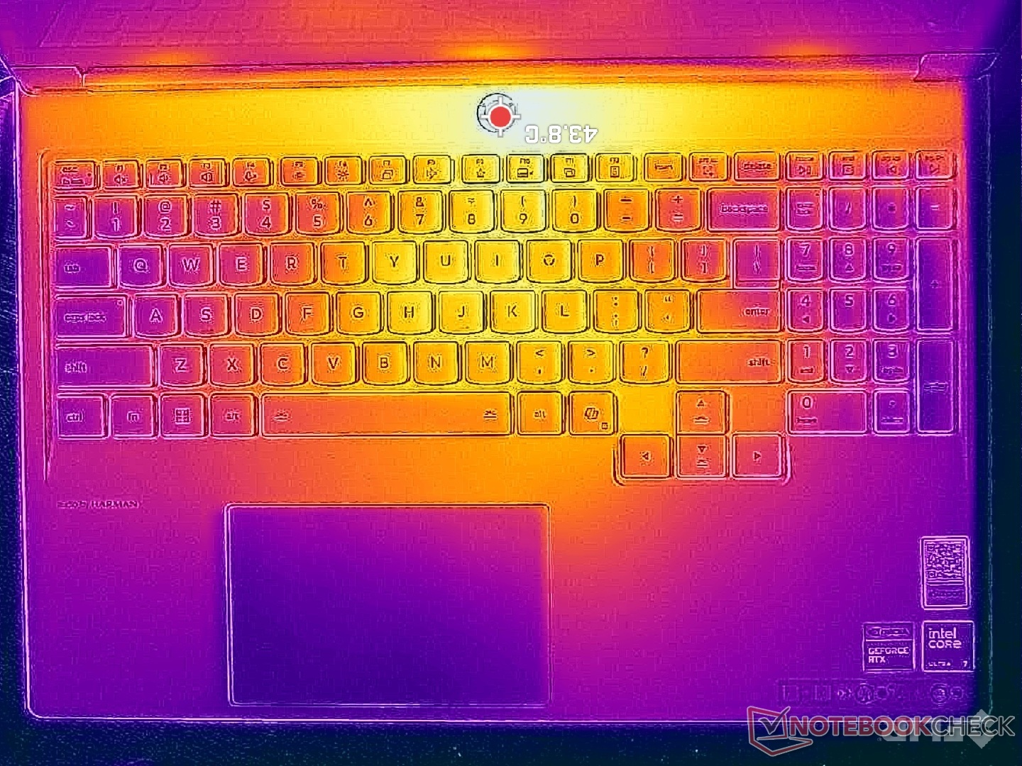Yttemperaturerna är varma även när datorn bara går på tomgång på skrivbordet. Heta punkter vid spelande kan nå över 47 C och 41 C på ovansidan respektive undersidan av basen, men dessa områden är tack och lov mot strömknappen där fingrarna är mindre benägna att röra vid. Genomsnittstemperaturerna är ändå varmare än vad vi upplevde på Asus TUF Gaming A16.