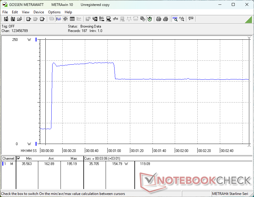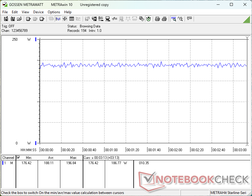 Den totala förbrukningen är ganska krävande för en bärbar RTX 5060-dator, eftersom de flesta andra bärbara datorer med samma GPU vanligtvis inte levereras med processorer i Core-HX-serien. Alienware 16 Aurora kräver till exempel bara 123 W när man kör Cyberpunk 2077 jämfört med våra 188 W. Även den AMD-drivna Razer Blade 16 med sin mycket mer kapabla RTX 5080 GPU skulle kräva bara 4 procent mer ström för en massiv 60 till 90 procent spelprestandaökning jämfört med vår Legion 7 16.