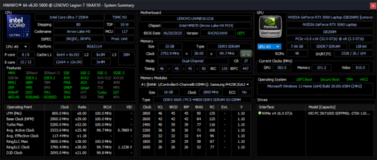 Lenovo Legion 7 16IAX10 Intel Core Ultra 7 255HX ⎘ Nvidia GeForce RTX 5060 Laptop ⎘ 32 GB Minne, 1024 GB SSD | Amazon: $2,349.00 Listpris: 1650 USD | 2 kg | 17.9 mm | 16.00" 2560x1600 189 PPI OLED | |