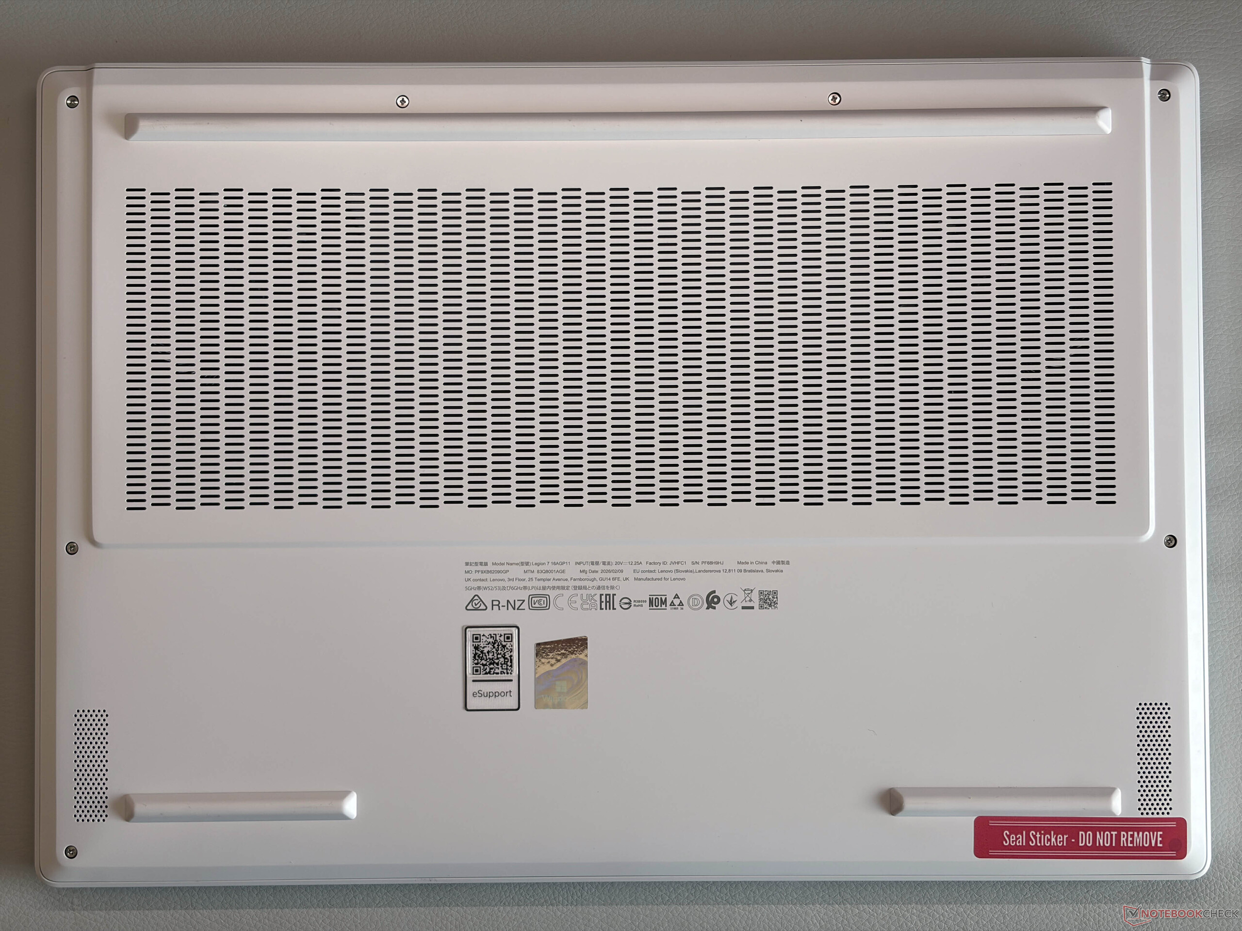 Vår vita testenhet ser väldigt fin ut och aluminiumytorna drar inte till sig fingeravtryck eller smuts, så den är väldigt lätt att hålla ren. Belysningselementen hålls till ett minimum. Den lägre vikten påverkar inte stabiliteten och den nya AMD-modellen är lika robust som tidigare. Gångjärnen (max. öppningsvinkel 180 grader) är också väljusterade och håller studsandet till ett minimum. Underhållsalternativen är begränsade till M.2-2242 SSD, en ledig M.2-2280-kortplats, Wi-Fi-modulen samt rengöring av fläktarna, medan RAM-minnet är lödd.