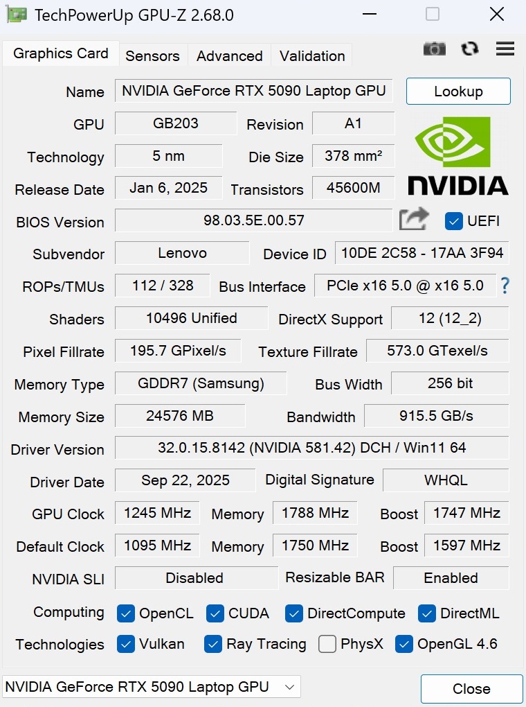 | Alienware 18 Area-51 Intel Core Ultra 9 275HX ⎘ Nvidia GeForce RTX 5090 Laptop ⎘ 64 GB Minne | Amazon: $3,431.86 Listpris: 4400 USD | 4.2 kg | 24.32 mm | 18.00" 2560x1600 168 PPI IPS | |