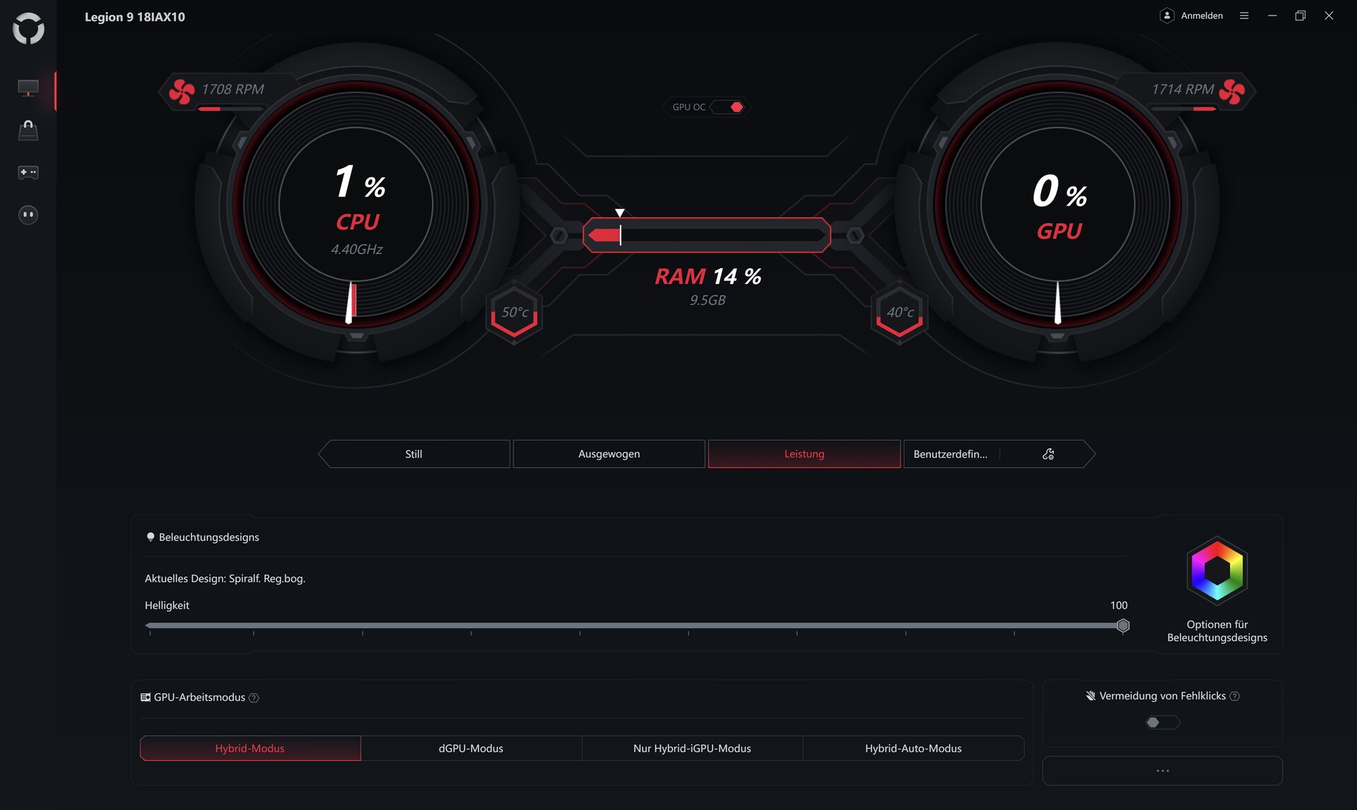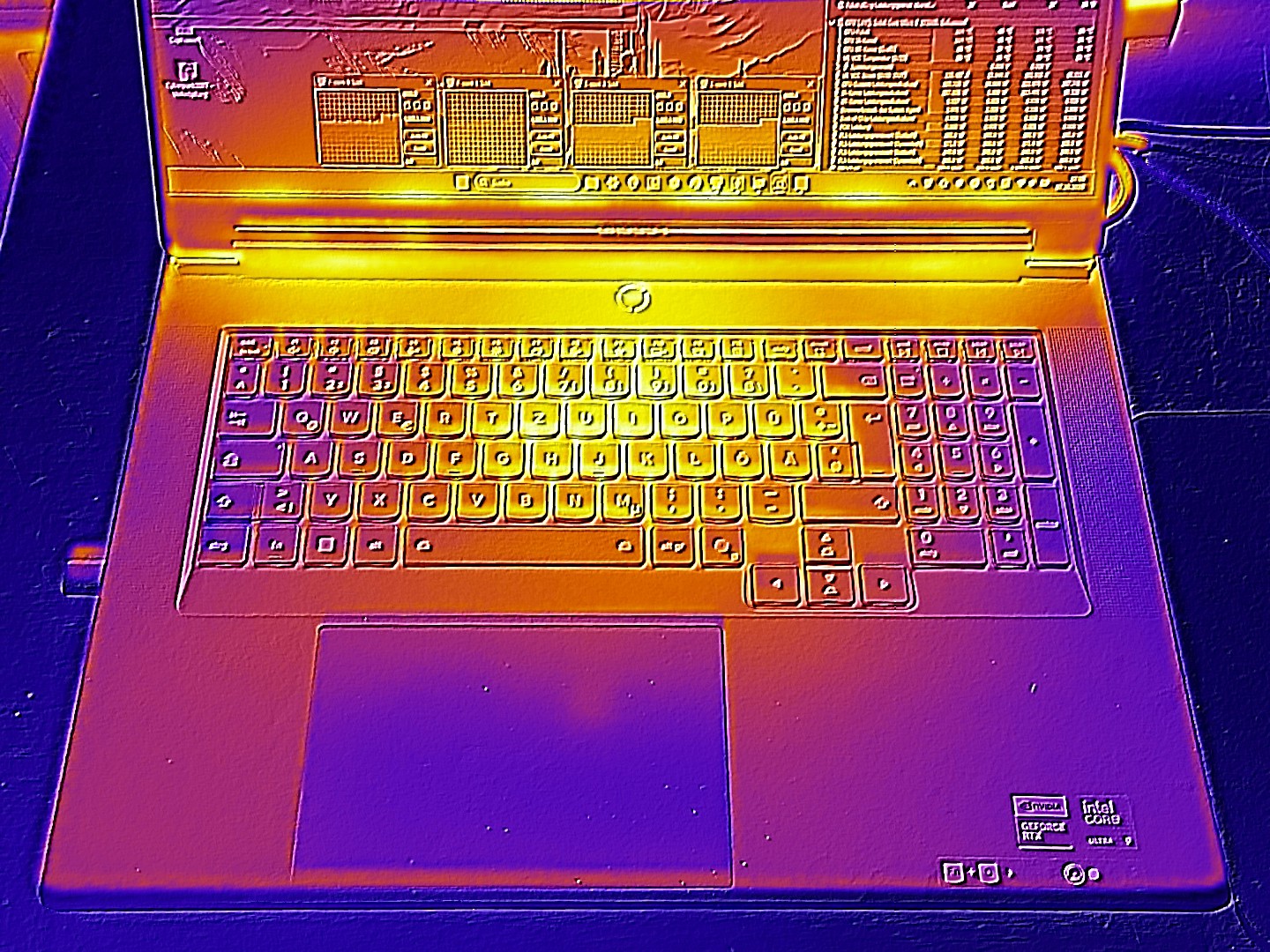 Precis som med RTX 5080-modellen är temperaturutvecklingen något märklig. Medan Legion 9 18 redan blir relativt varm i viloläge, värms chassiytorna knappt upp under belastning men når ibland liknande värden.