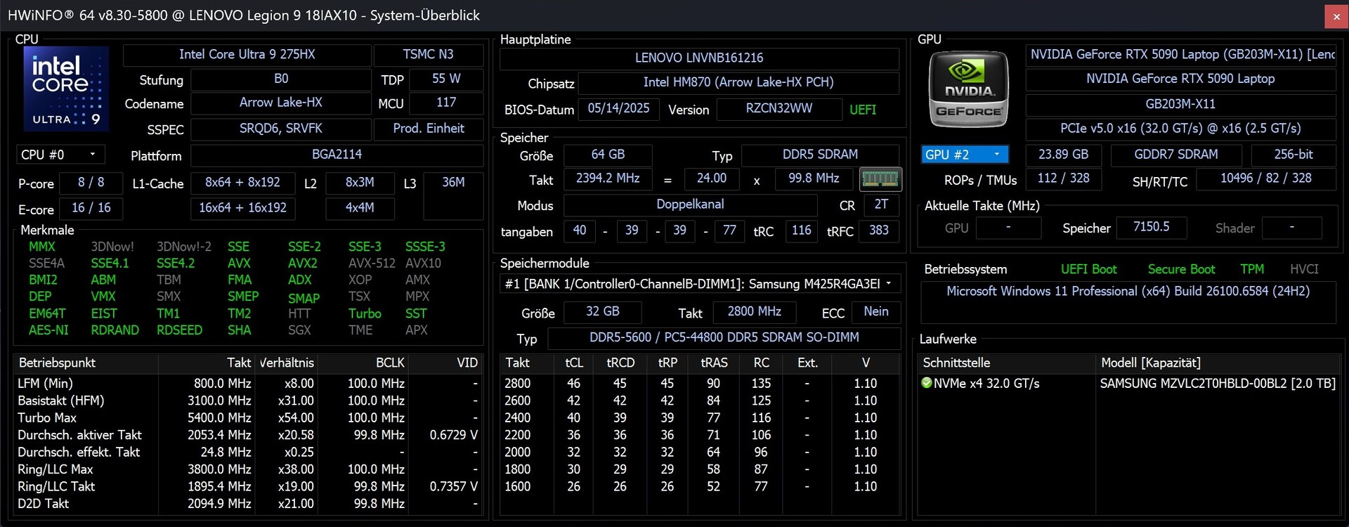| Lenovo Legion 9 18IAX10 Intel Core Ultra 9 275HX ⎘ Nvidia GeForce RTX 5080 Laptop ⎘ 64 GB Minne, 2000 GB SSD | Amazon: $2,749.95 Listpris: 3800 USD | 3.5 kg | 27.95 mm | 18.00" 3840x2400 252 PPI IPS |