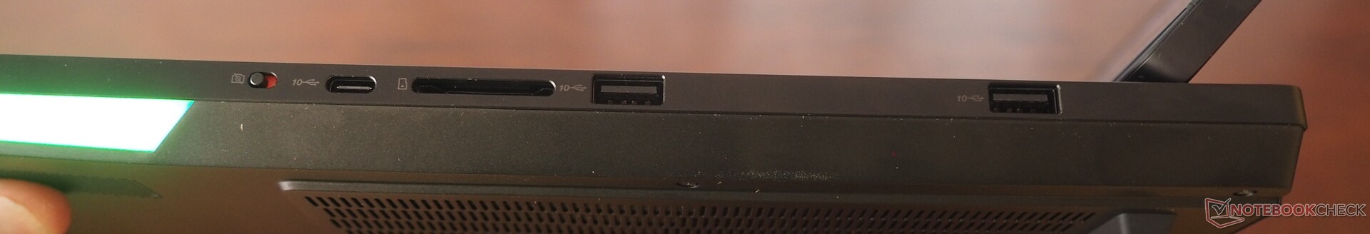 Antalet och mångfalden av anslutningar lämnar inget att önska, särskilt eftersom Lenovo har installerat moderna gränssnitt (se nedan). Intressant nog var kortläsaren långsammare än på RTX 5080-versionen, medan den trådlösa modulen levererade betydligt bättre resultat. Webbkameran på 5 MP, som erbjuder en e-shutter, producerar anständiga bilder.