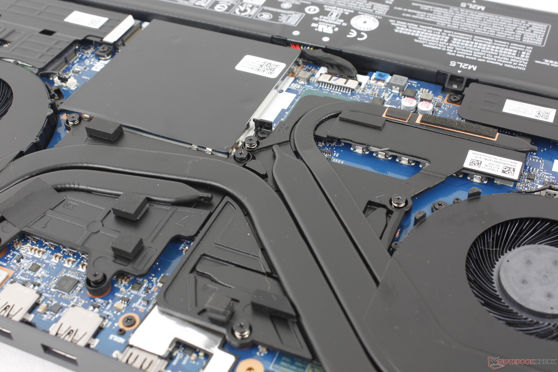 Moderkortet innehåller endast mindre förändringar från förra årets design. WLAN-, RAM- och två SSD-kortplatser är skyddade under ytterligare aluminiumplattor. Intressant nog använder Legion Pro 5 16 färre men tjockare kopparvärmerör än Legion 5 16-designen.