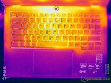Yttemperaturerna är varmast mot tangentbordets mitt och baksida där de kan nå upp till 36 C respektive 52 C när man kör krävande belastningar som spel. Systemet är något varmare än Blade 14 i genomsnitt även om Lenovo-designen innehåller fler ventilationsgaller. Handflatestöden och klickplattan är fortfarande svalare och mer behagliga att ta på.