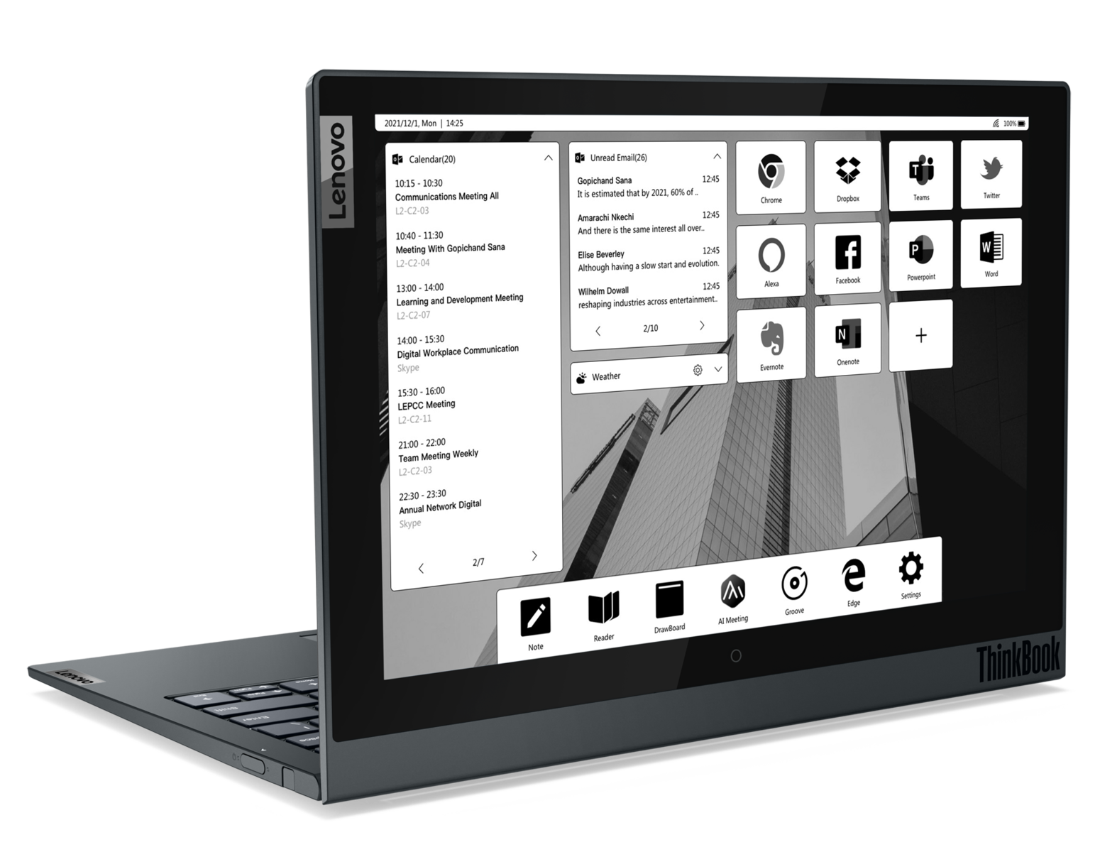 The Thinkbook Plus G2 has a built in e-ink display on the back that can be used when the computer lid is closed. The e-ink display is touch enabled and also works with the built in pen. It has a few custom apps and can run any of the Windows apps installed on the computer (within reason).