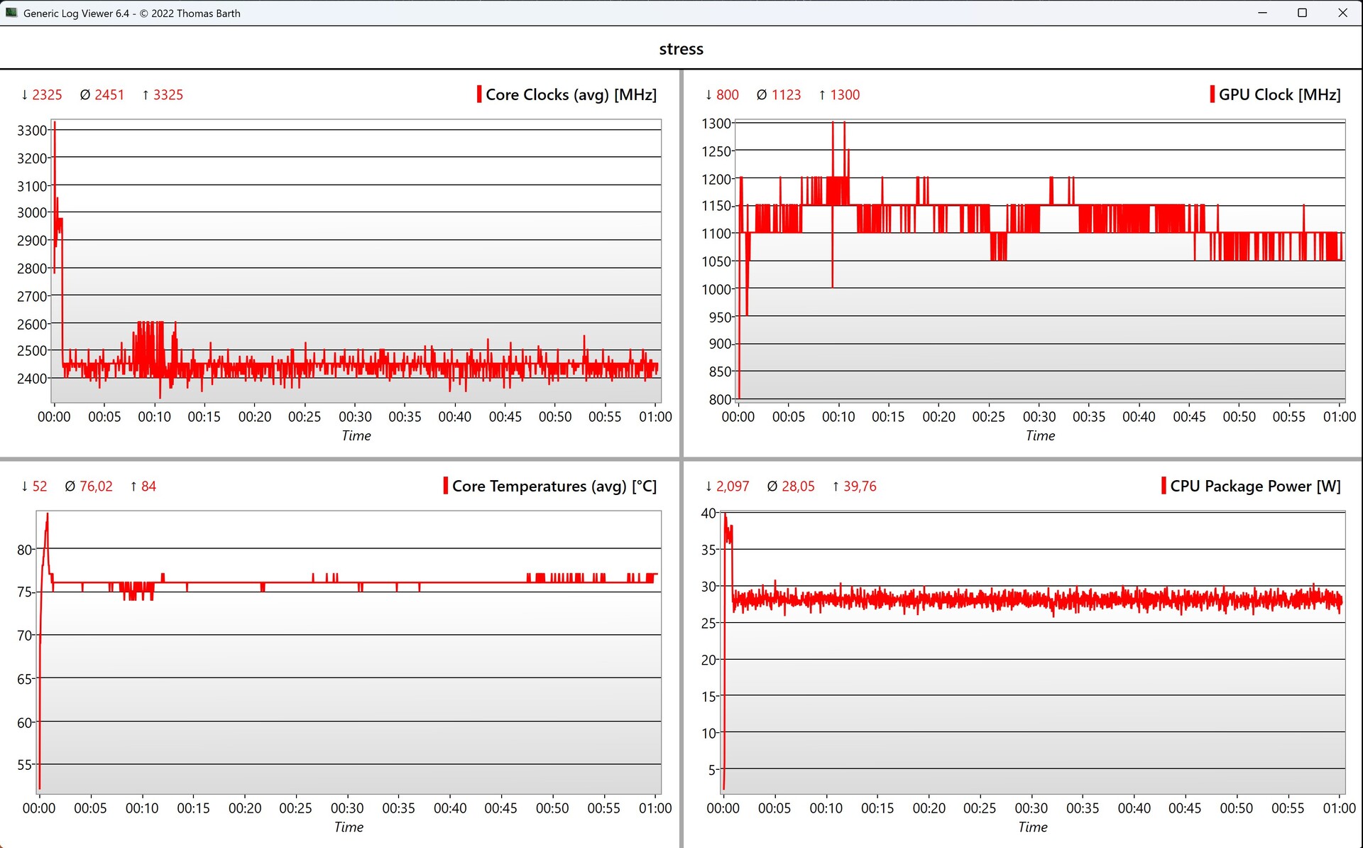 Lunar Lake-modellen har en strömförbrukningsfördel jämfört med Arrow Lake E14. Under belastning når den en topp på 61 watt för att sedan snabbt sjunka till cirka 48 watt. Den medföljande 65-watts nätadaptern är därför mer än tillräcklig.