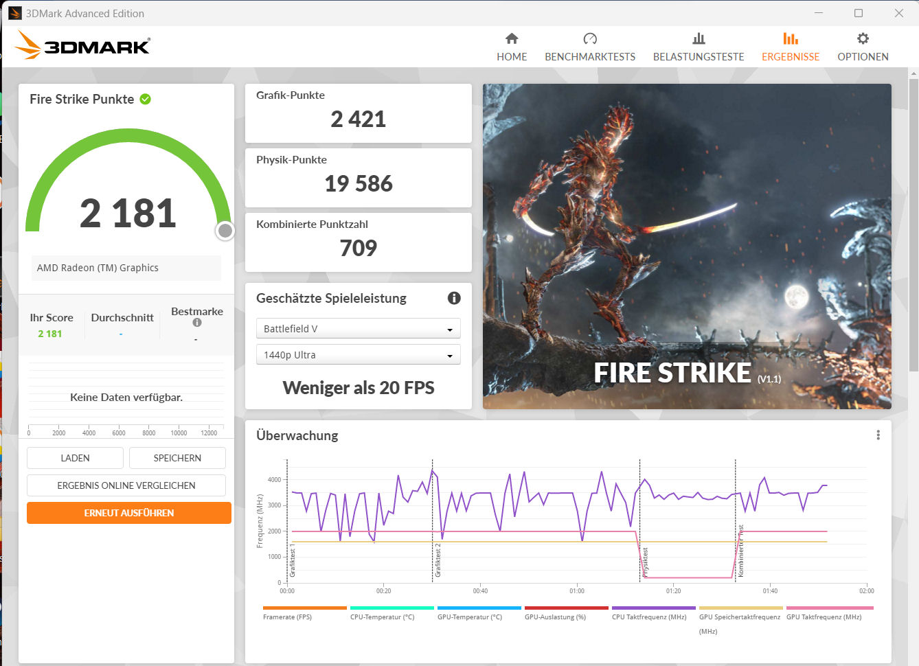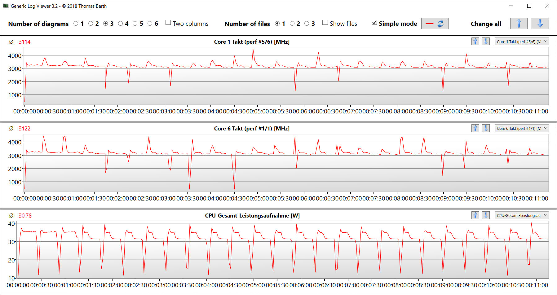 Stresstestet, som omfattar kontinuerlig drift av Prime95 och Furmark, utgör ett extremt scenario för att testa systemets stabilitet under full belastning. I början av testet arbetar CPU:n med klockfrekvenser på 3,4 till 3,6 GHz, vilket gradvis minskar till 3 till 3,1 GHz under testets gång. Samtidigt upplever GPU-klockfrekvensen en minskning från 2 GHz till 1,4 GHz efter en kort tid och stannar kvar på denna lägre nivå.