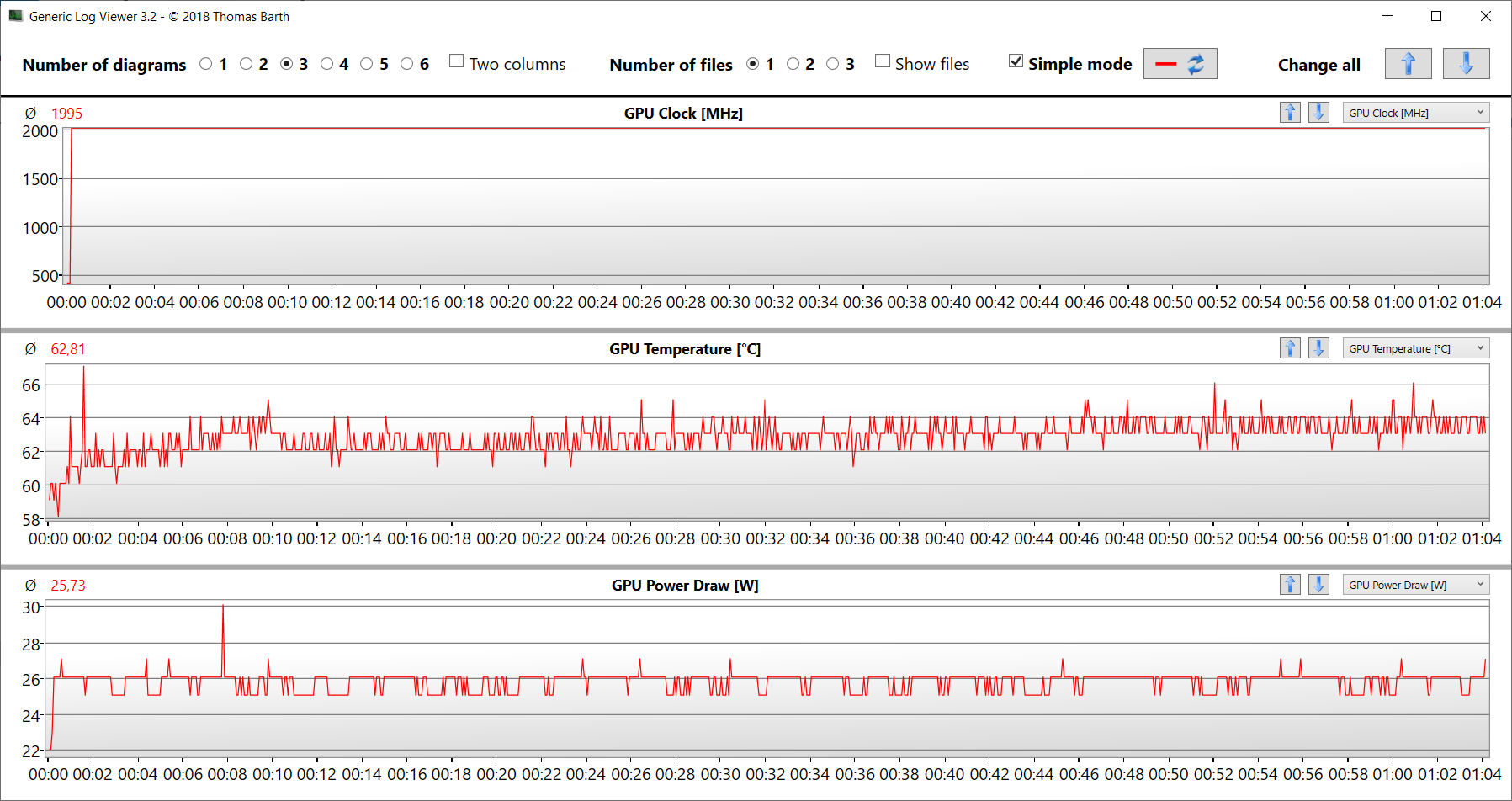 Strömförbrukningen ligger i linje med den förväntade nivån för den installerade hårdvaran. Under Witcher 3 -testet med konstant strömförbrukning finns det en märkbar minskning av efterfrågan som observerats i stresstestet. Det medföljande nätaggregatet (65 watt) är tillräckligt dimensionerat för systemet.