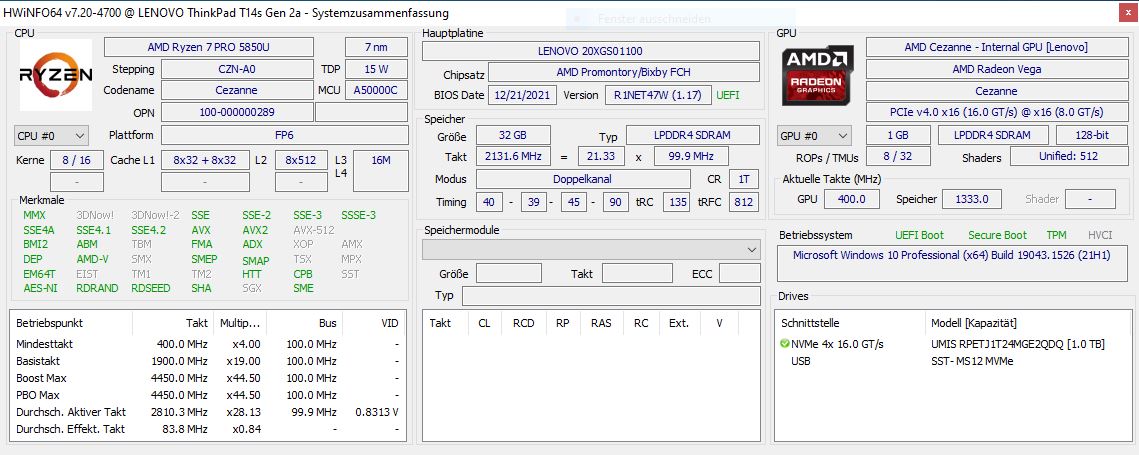 | 90.1 % v7 (old) | 03/2022 | Lenovo ThinkPad T14s G2 20XGS01100 R7 PRO 5850U, Vega 8 | 1.3 kg | 16.14 mm | 14.00" | 1920x1080 | |