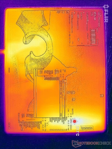 Yttemperaturerna i porträttläge är mycket varmare på den övre halvan än på den undre halvan på grund av moderkortets placering, precis som på Zenbook 17 Fold. Hot spots på fram- och baksidan kan nå upp till 43 C på varje sida, vilket framgår av temperaturkartorna nedan. Det är kanske ingen tillfällighet att Zenbook 17 Fold och Surface Pro 9 också når liknande maximala värden under liknande förhållanden. De heta punkterna är mot mitten av skärmen och därför är kanterna aldrig obekväma att hantera i surfplatteläge.