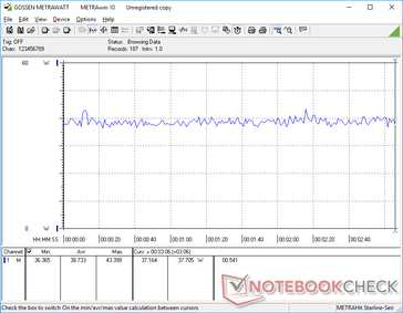 Strömförbrukningen är i stort sett i linje med traditionella bärbara datorer. Den fläktlösa designen sparar visserligen ström, men den stora och krävande OLED-pekskärmen upphäver de potentiella besparingarna. Om du t.ex. kör på tomgång på en ljusvit skärm (t.ex. en webbsida eller Word-sida) med maximal ljusstyrka drar ThinkPad X1 Fold 22 W jämfört med bara 11 W eller 10 W på den IPS-baserade Microsoft Surface Pro 9 eller HP Elite Dragonfly Folio.