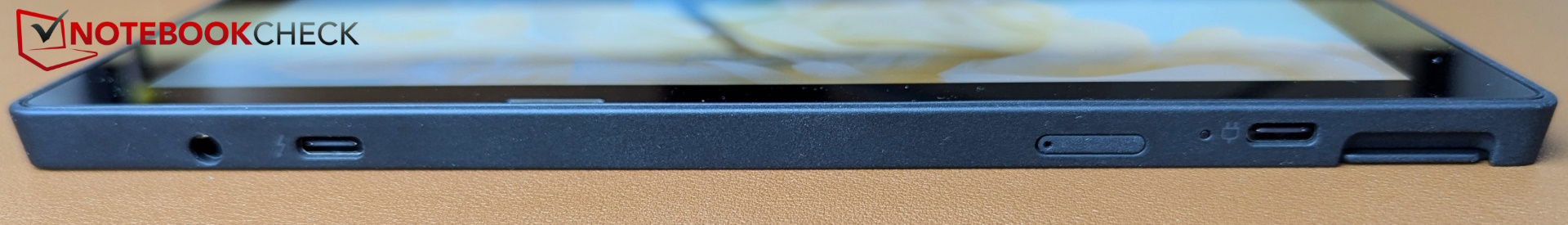 Även för en (Windows) surfplatta finns det väldigt få av dem: två USB-C-portar och en ljudjackutgång, det är allt. Endast den övre av de två USB-portarna stöder Thunderbolt 4; den nedre porten överför data med maximalt 10 Gbit/s. Så snart den nedre porten är ansluten till laddningskabeln har vi fortfarande exakt en USB-C-port tillgänglig. En extern docka är nästan obligatorisk, åtminstone när du använder den som en bärbar dator. Förutom en Kensington-port finns det bara SIM-kortplatsen, som har plats för ett nano-SIM.