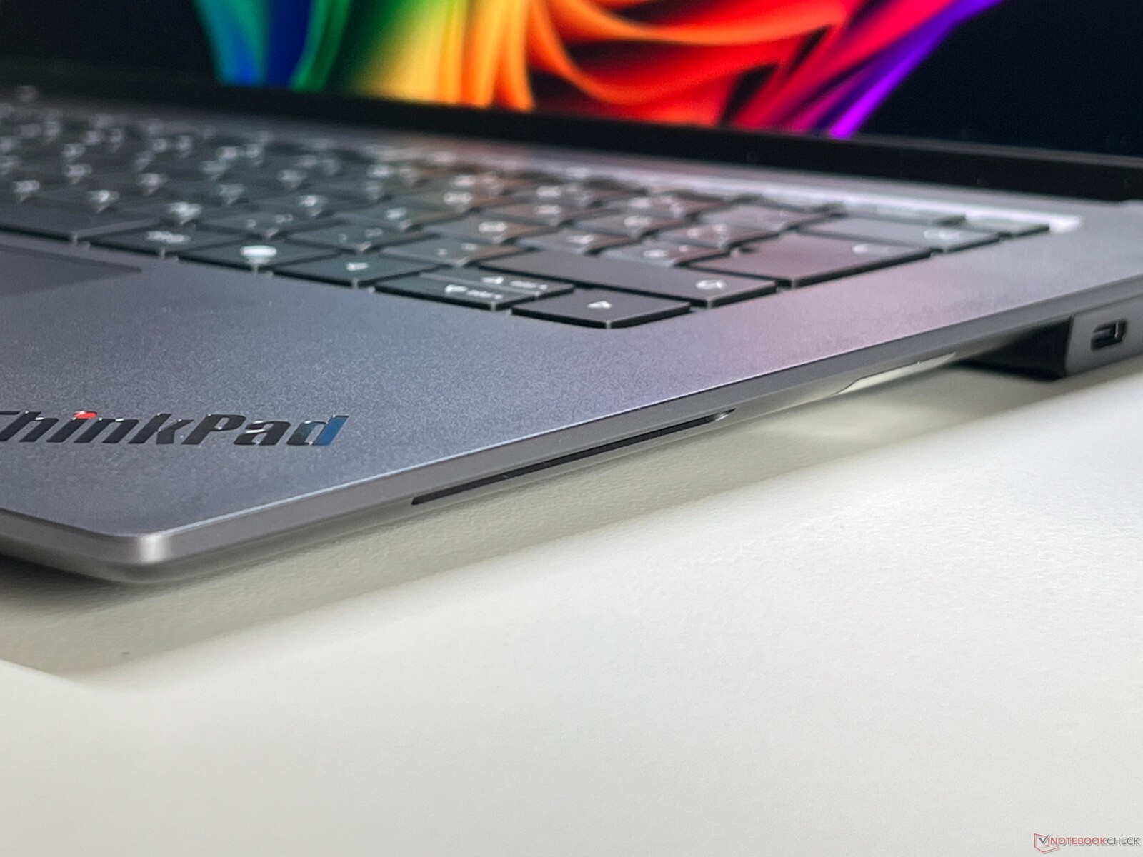 Sammantaget är skrivupplevelsen på det nya tangentbordet mycket bekväm, och vi blev positivt överraskade av den exakta återkopplingen, trots den begränsade tangentrörelsen på 1,35 mm. De enda två undantagen var mellanslagstangenten och returtangenten, som skramlar lite mer och dessutom är mycket mer högljudda. Lenovo borde definitivt ta en ny titt på dessa två tangenter. Strömknappen (inklusive fingeravtrycksläsare) är placerad i det övre högra hörnet och är lätt att hitta med fingrarna. Den vita bakgrundsbelysningen med två intensitetsnivåer kan aktiveras via sensorn.