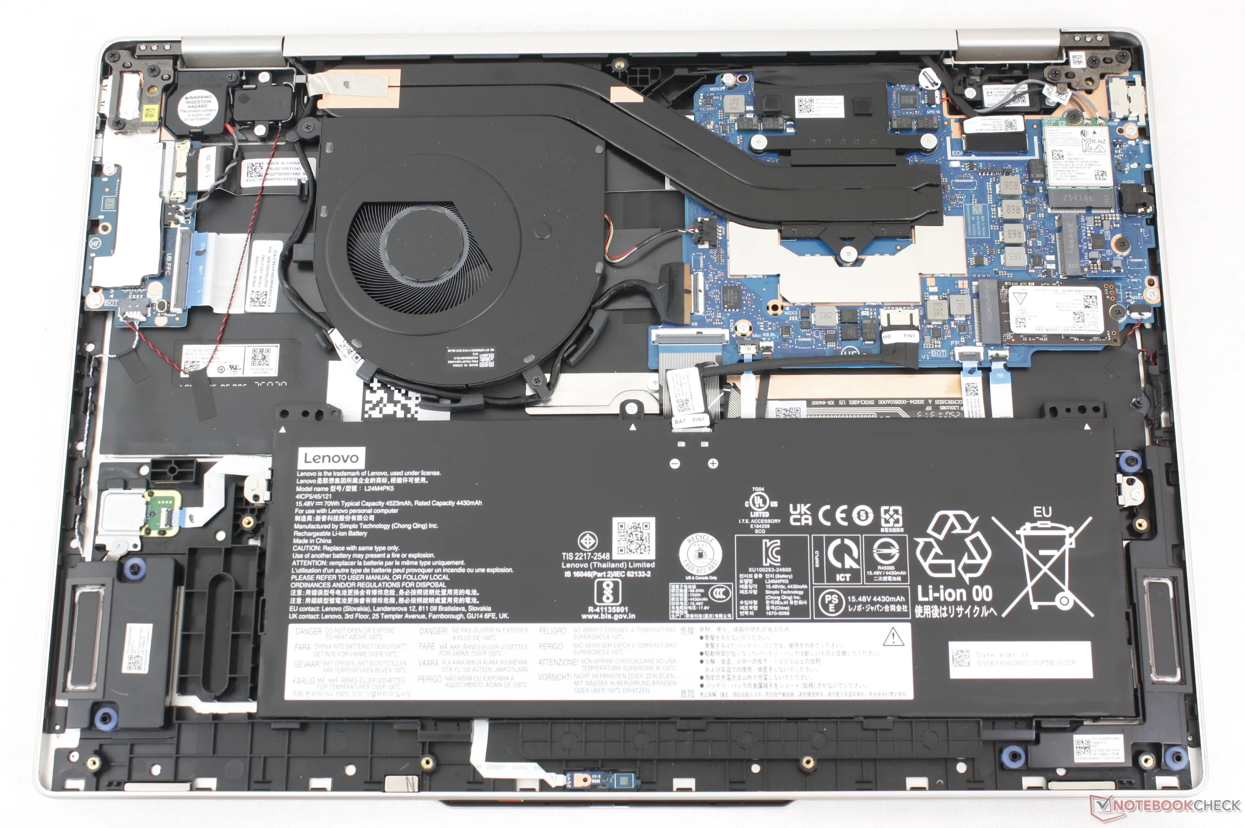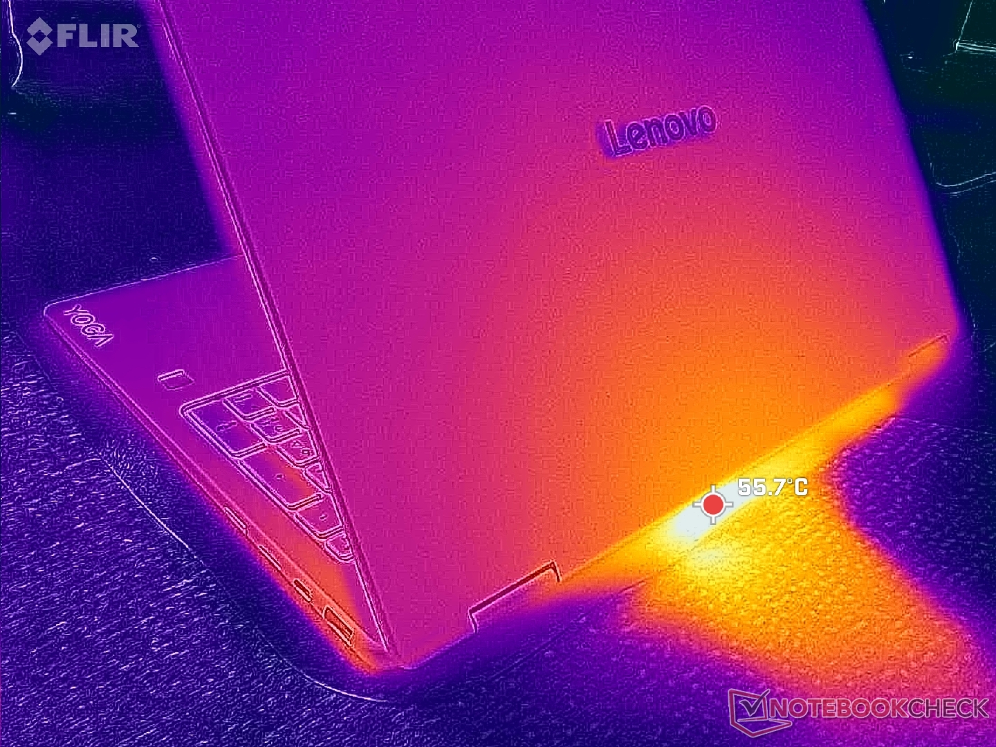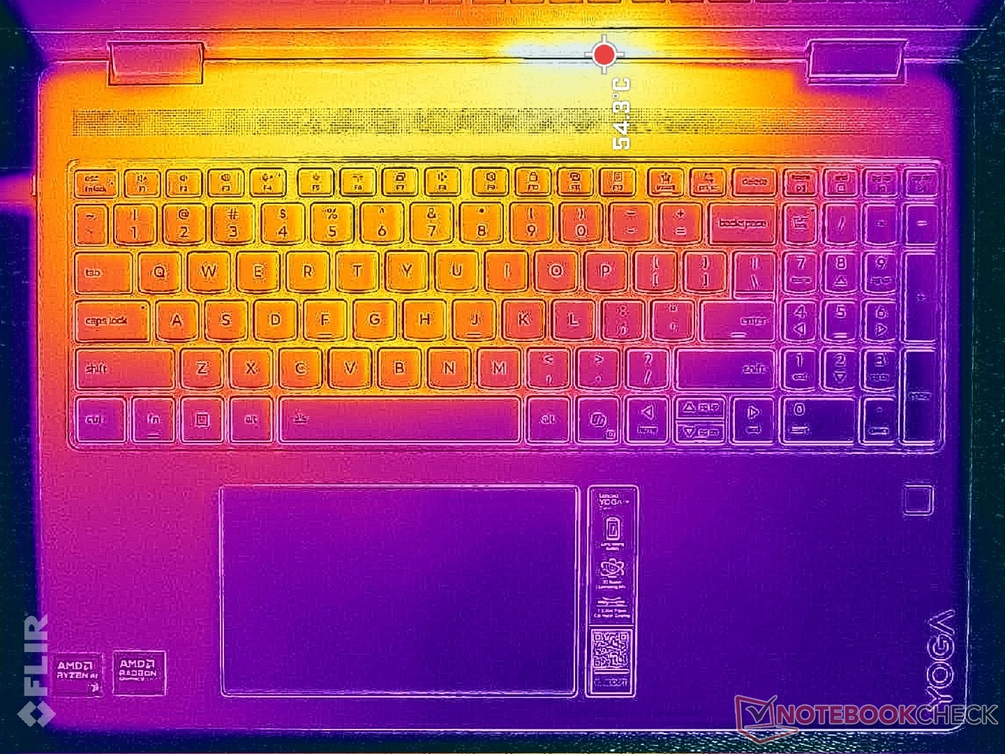 Yttemperaturerna kan vara varmare än i Lunar Lake-V-konfigurationen. När du kör krävande belastningar som spel, till exempel, kan heta punkter på tangentbordsdäcket och bottenkåpan nå över 48 C respektive 45 C, jämfört med 43 C och 37 C på Intel-alternativet.