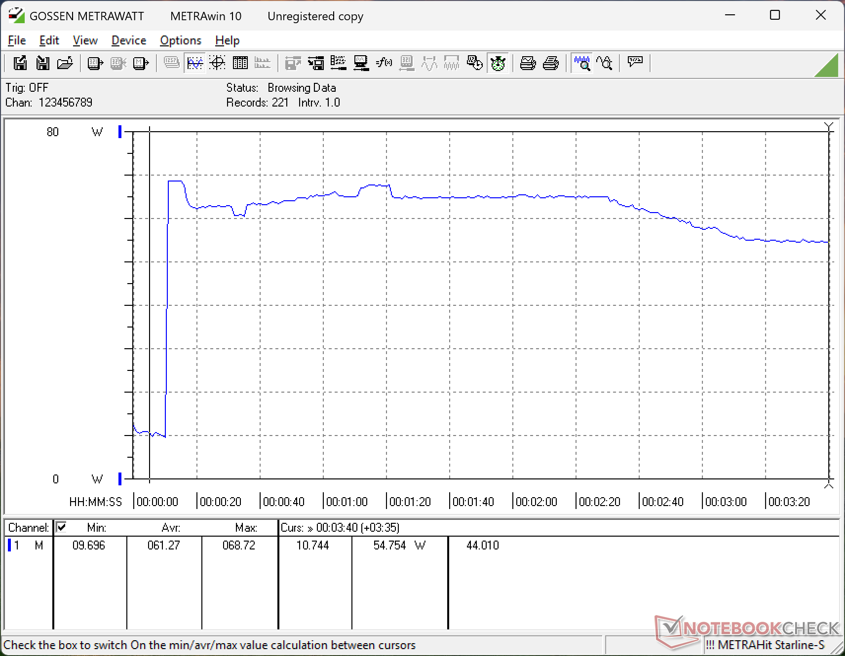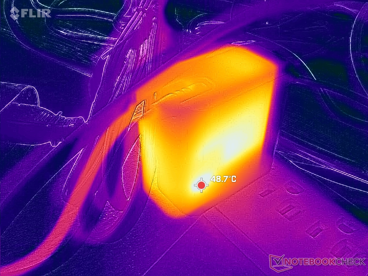 Vi kan mäta ett tillfälligt maximalt uttag på 69 W från den lilla (~5,5 x 5,5 x 2,9 cm) 65 W USB-C AC-adaptern när processorn är fullt belastad.