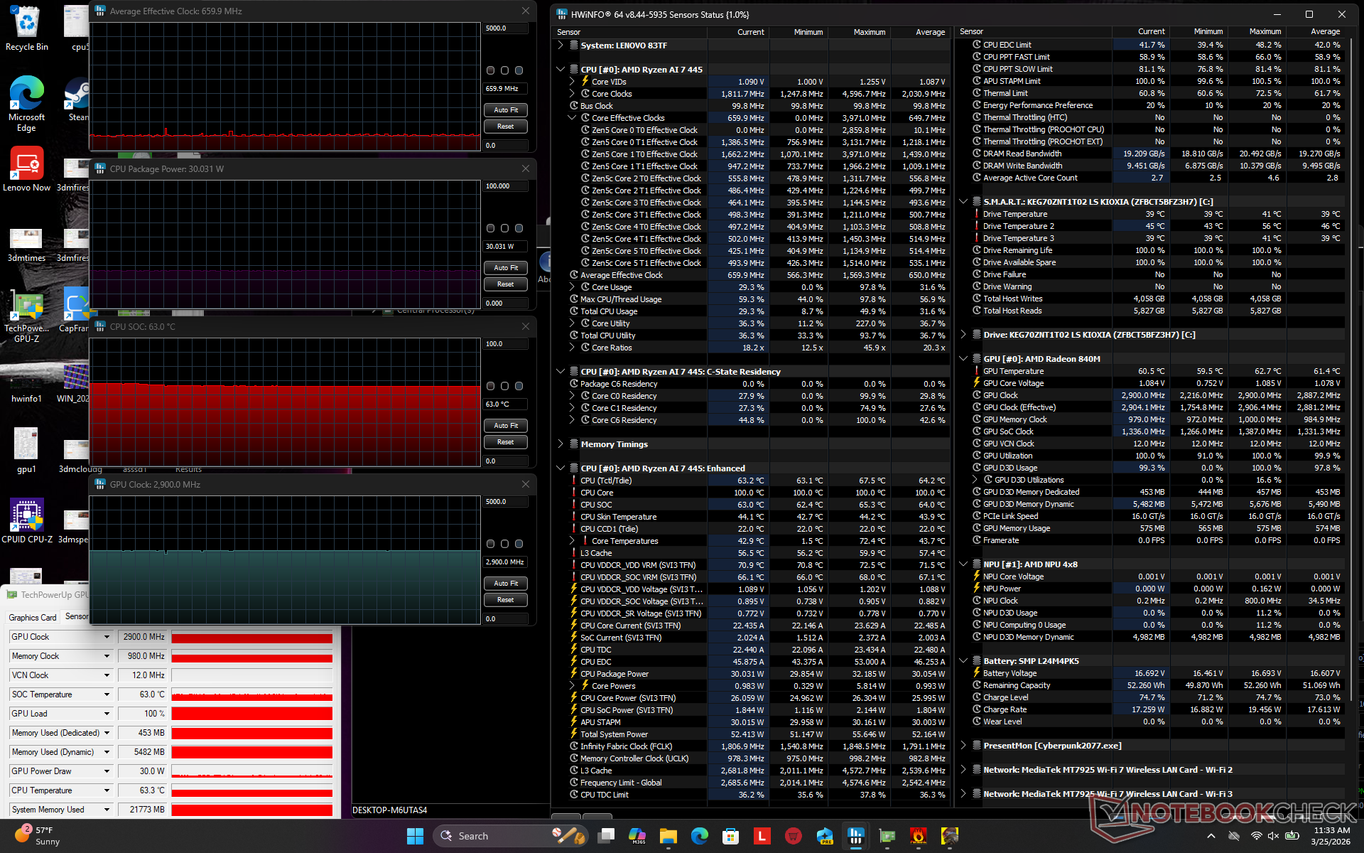 Energieffektiviteten är markant sämre än 2025 Lunar Lake-V-modellen, även om man tar hänsyn till den något snabbare multithread-prestandan i vår AMD-modell. När vi till exempel kör Prime95 kräver vårt AMD-system nästan 40 procent mer ström för en relativt liten prestandaförbättring på 15 procent. Fördelen är ännu större till Intels fördel när vi jämför grafikprestanda, eftersom vårt AMD-system fortfarande drar mer ström när vi kör Cyberpunk 2077 trots att iGPU:n i Intel-systemet är nästan 2,5 gånger snabbare.