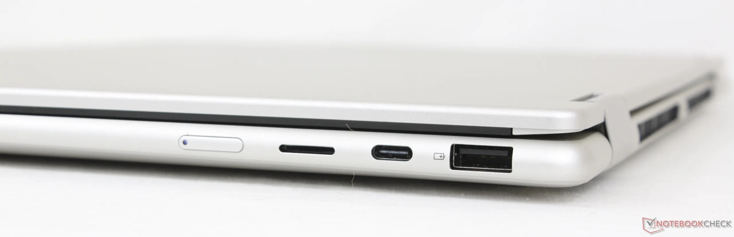 2026 Yoga 7 2-i-1 16 antar samma externa design som 2025-modellen och så alla våra befintliga kommentarer om förra årets modell gäller fortfarande. Tänk på att även om portalternativen är desamma som tidigare, saknar USB-C-portarna på vår AMD-modell Thunderbolt-stöd och är begränsade till endast 10 Gbps medan samma USB-C-portar på 2025 Intel-modellen är mycket snabbare med upp till 40 Gbps.