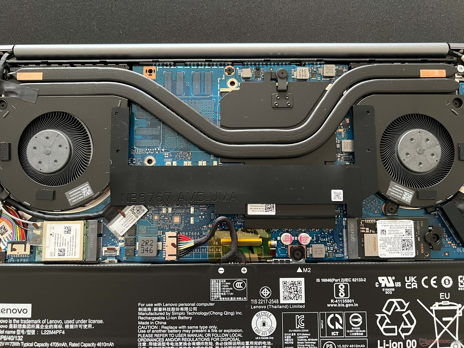 Det nedre höljet sitter fast med Torx-skruvar (T5) och kan enkelt tas bort. På insidan kan du komma åt den kompakta M.2 2242 SSD, WLAN-modulen, fläktarna samt det fastskruvade batteriet. RAM-minnet, å andra sidan, är fastlött och kan inte uppgraderas.