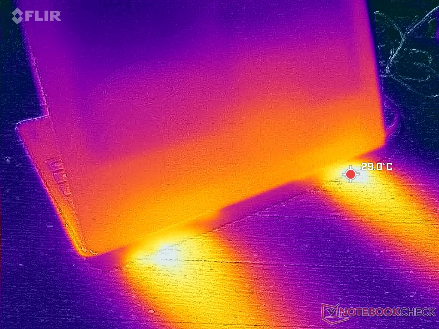 Yttemperaturerna är i allmänhet svalare än förväntat i förhållande till andra 14-tums subnotebooks. Heta fläckar kan nå drygt 34 C och 41 C på tangentbordsdäcket respektive bottenkåpan, jämfört med över 42 C eller till och med 49 C på Yoga Pro 7 14 G9 och Vivobook S 14 OLEDrespektive. De heta punkterna är också mot den bakre halvan av chassit och så temperaturökningen är inte ett problem under vanlig användning.