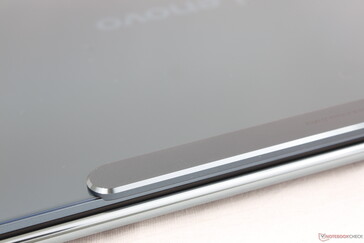 Yoga Slim 9 14 Gen 10-designen är en utveckling av Yoga Slim 9i 14 Gen 9. Det glansiga ytterlocket i 2,5D-glas är tillbaka för att skilja modellen från konkurrenterna medan de blanka kanterna och hörnen står i kontrast till de mattare ThinkPad-designerna. När chassit är stängt är det ganska reflekterande från alla vinklar för att vara ett blickfång på gott och ont.