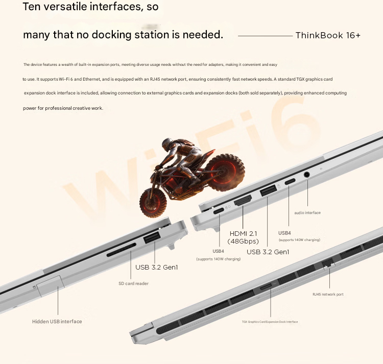 Förutom skärmen är resten av specifikationerna för de två AMD-drivna 2026 ThinkBook 16 Plus och 14 Plus identiska. Båda har stöd för upp till 8 TB PCIe 4.0-lagring, och Lenovo har parat ihop AMD APU med 32 GB LPDDR5x RAM-minne som körs med 7500MT/s. Förutom TGX-porten har de bärbara datorerna följande portar: