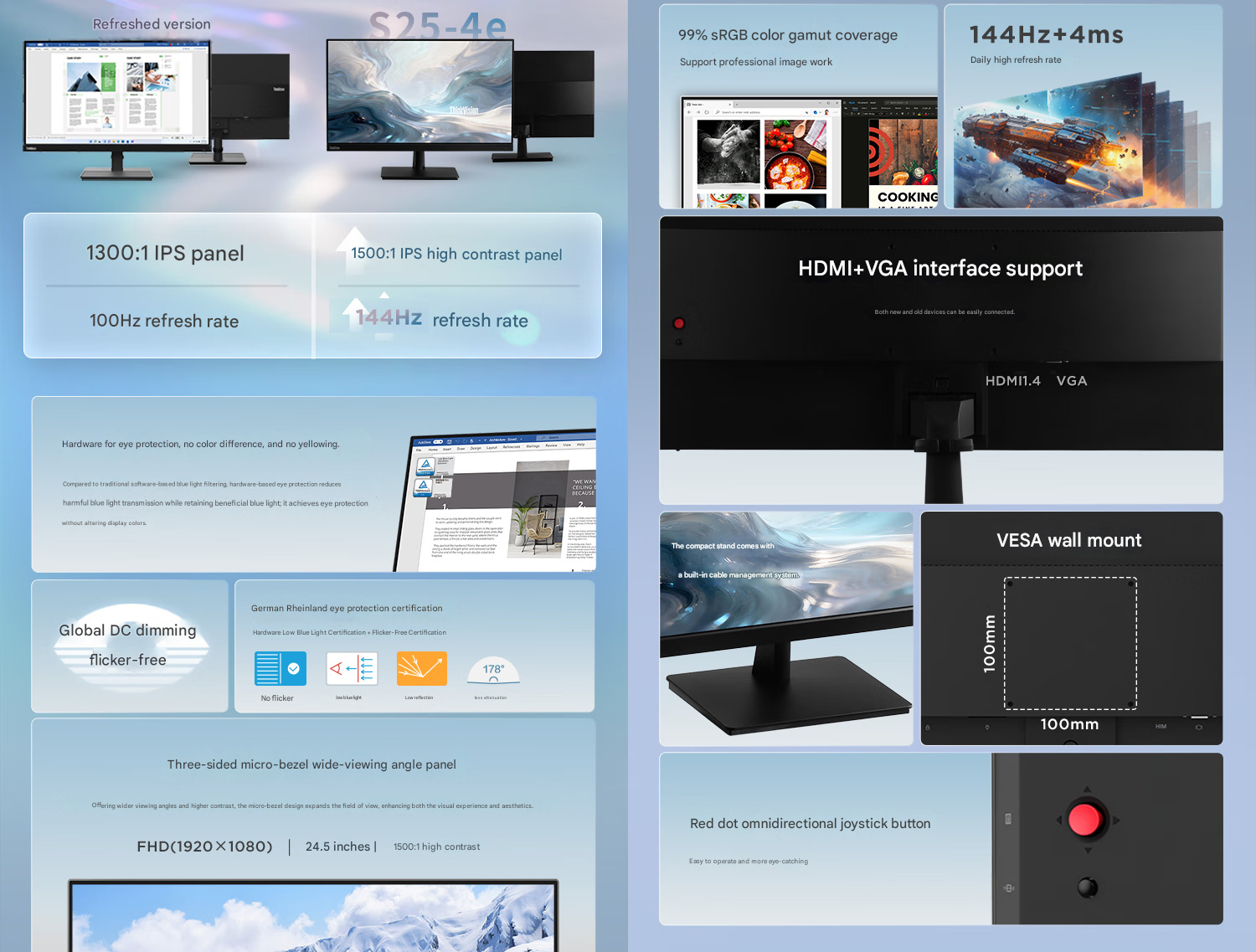 Med ett kontrastförhållande på 1500:1 lovar panelen också att erbjuda ljusa vita och mörka svarta nyanser. Det finns global DC-dimning och flera ögonskyddande funktionerlenovo ThinkVision S25-4e lovar att ge en bekväm tittarupplevelse under långa sessioner.