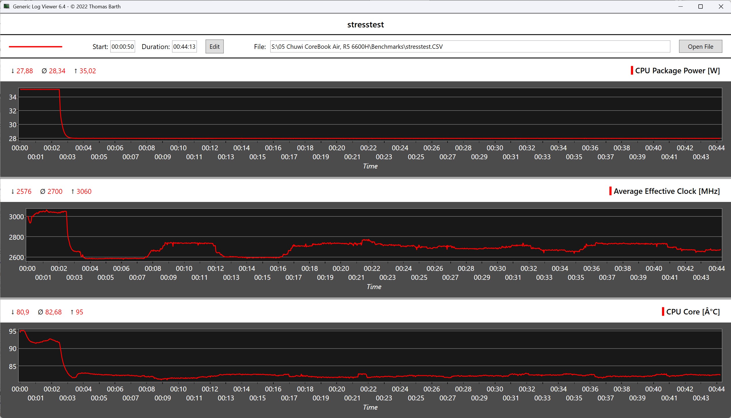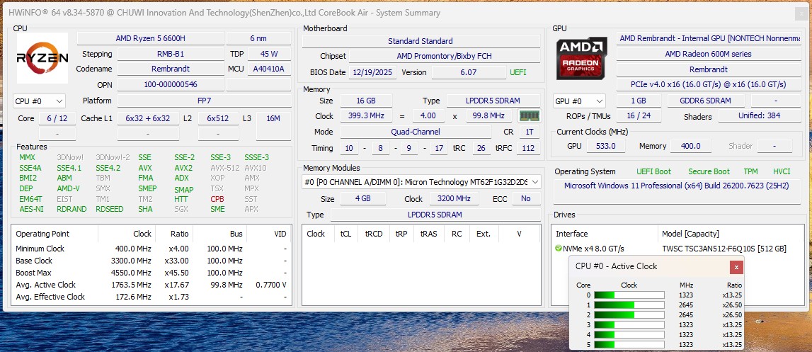 Chuwi CoreBook Air drivs av en AMD Ryzen 5 6600H, en 6-kärnig processor med 12 trådar, som är utformad för en balanserad mix av effektivitet och prestanda. Detta ger mer än tillräckligt med datorkraft för klassiska kontorsuppgifter, webbapplikationer, mediekonsumtion och parallellt arbete med flera program. I jämförelse rankas vårt testprov på samma nivå som AMD Ryzen 5 7535HS som används i Ninkear S14. Vid närmare granskning märks det att AMD Ryzen 5 6600H i CoreBook Air är permanent begränsad till cirka 28 watt. Som ett resultat är den tillgängliga prestandan lägre än vad processorn i princip skulle kunna uppnå. Jämfört med våra genomsnittliga värden med en identisk processor ligger den bärbara datorn efter prestandamässigt med cirka tio procent.